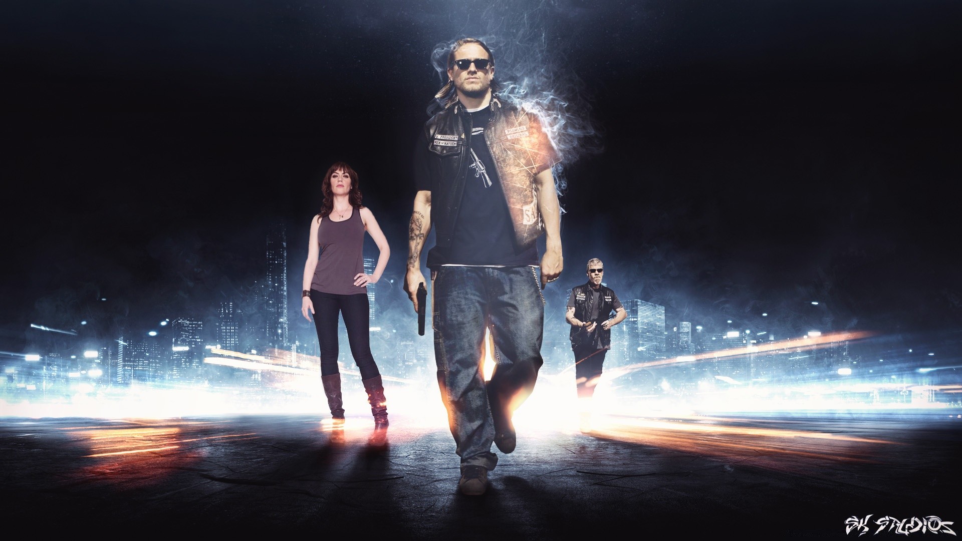 Um desfile de três pessoas em um belo fundo