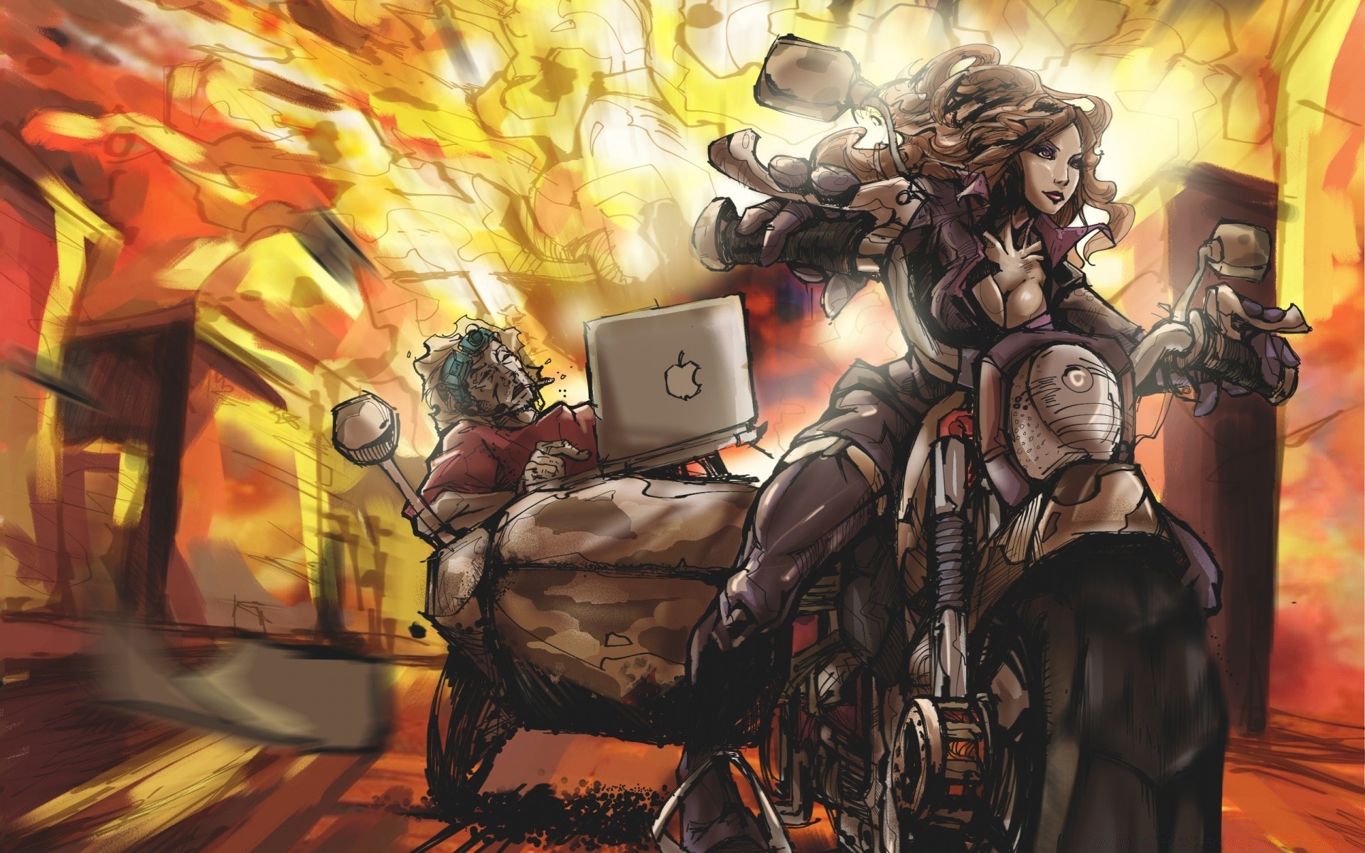 Figura mulher em uma motocicleta com uma explosão