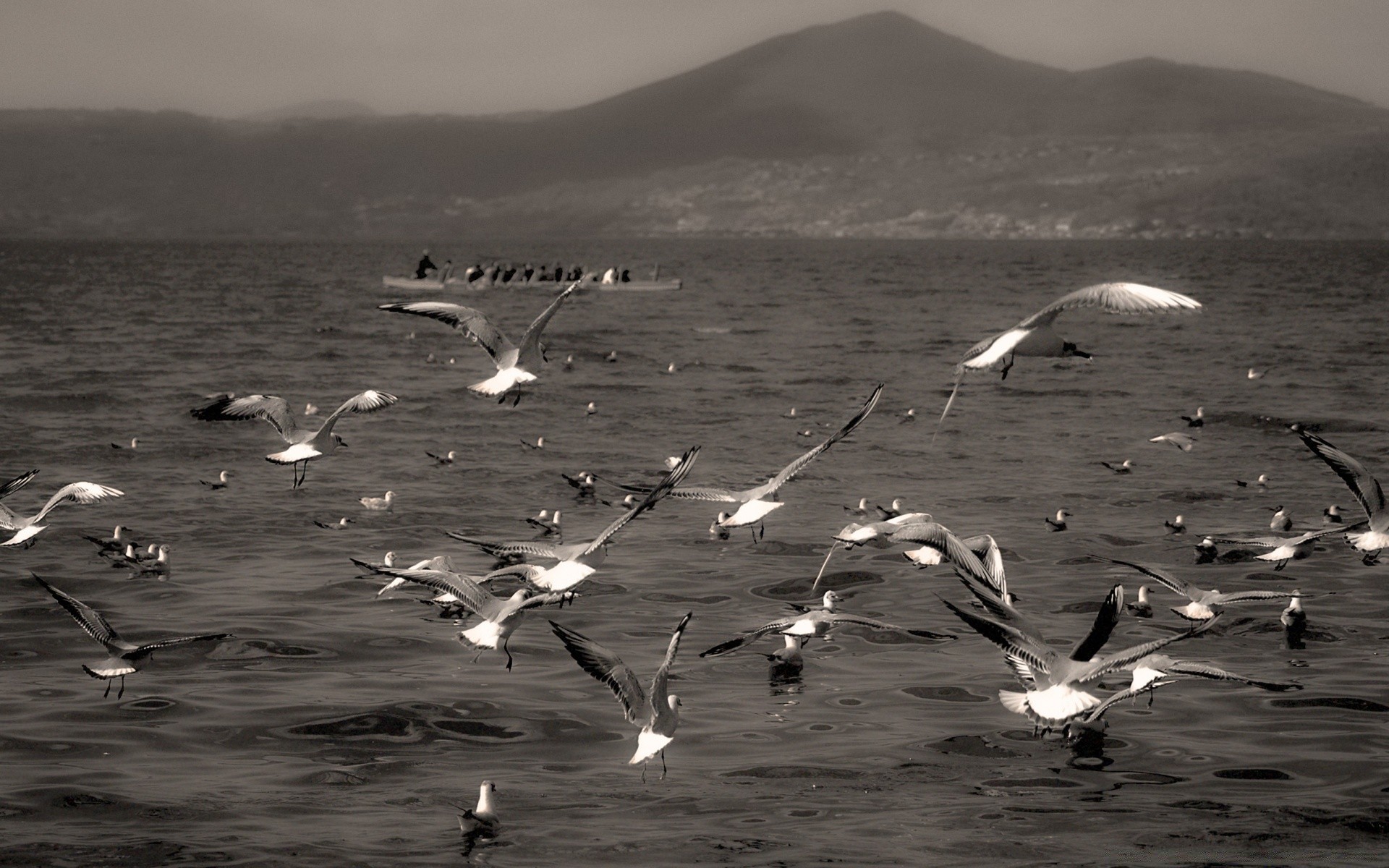 Paisagem natural com um bando de pássaros no fundo do pôr do sol