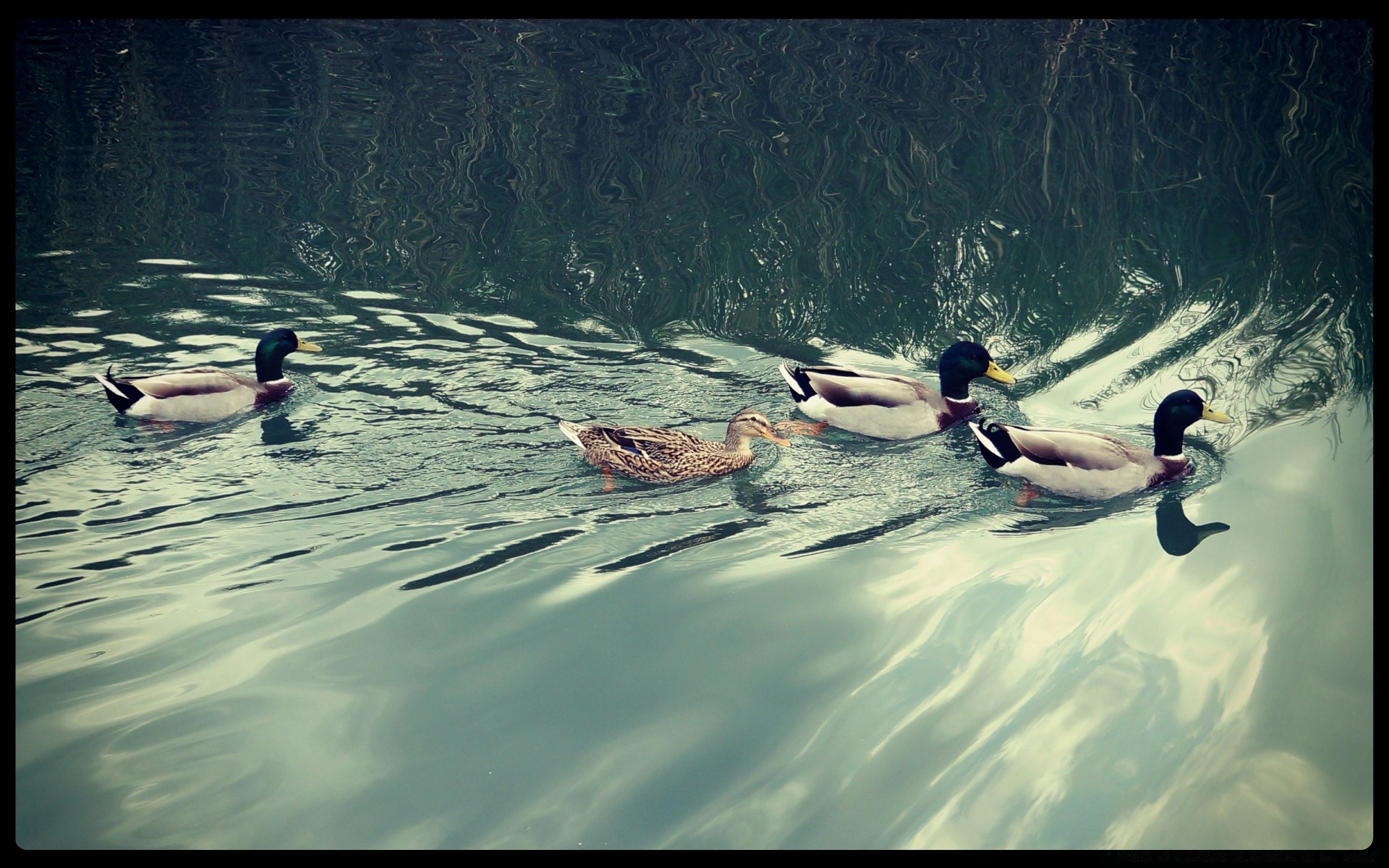 Um bando de patos nadando em um lago
