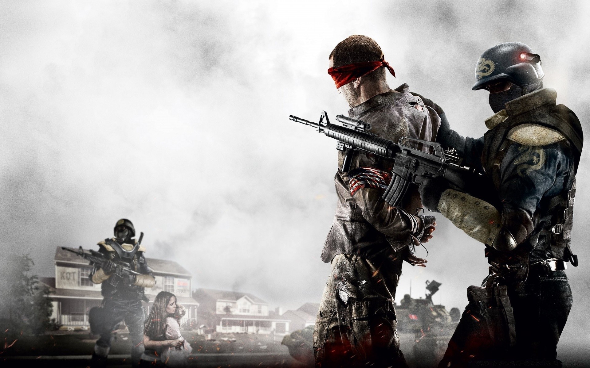 Heróis de um jogo de computador contra o pano de fundo de uma cidade destruída