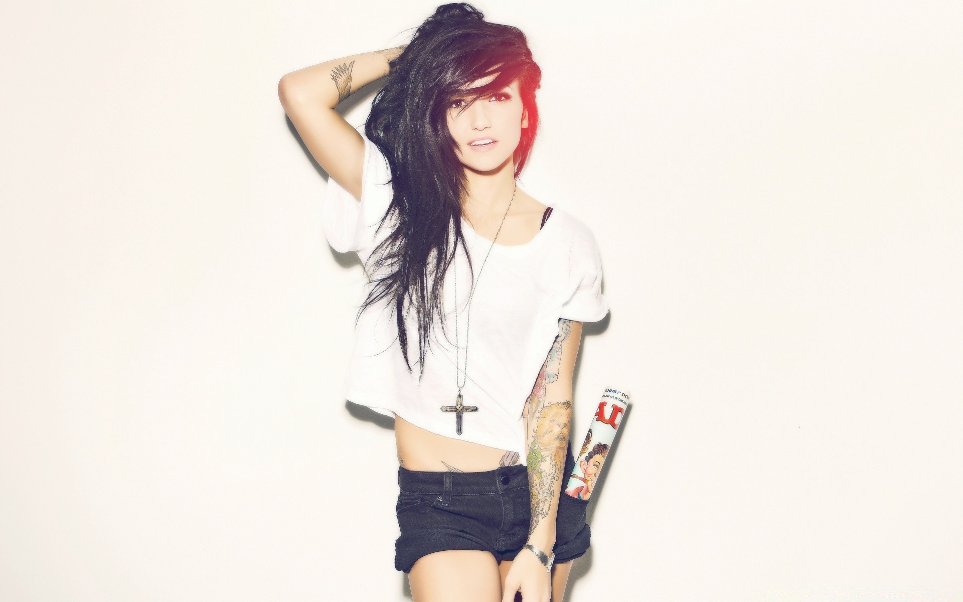 Uma bela cantora com uma tatuagem na cama