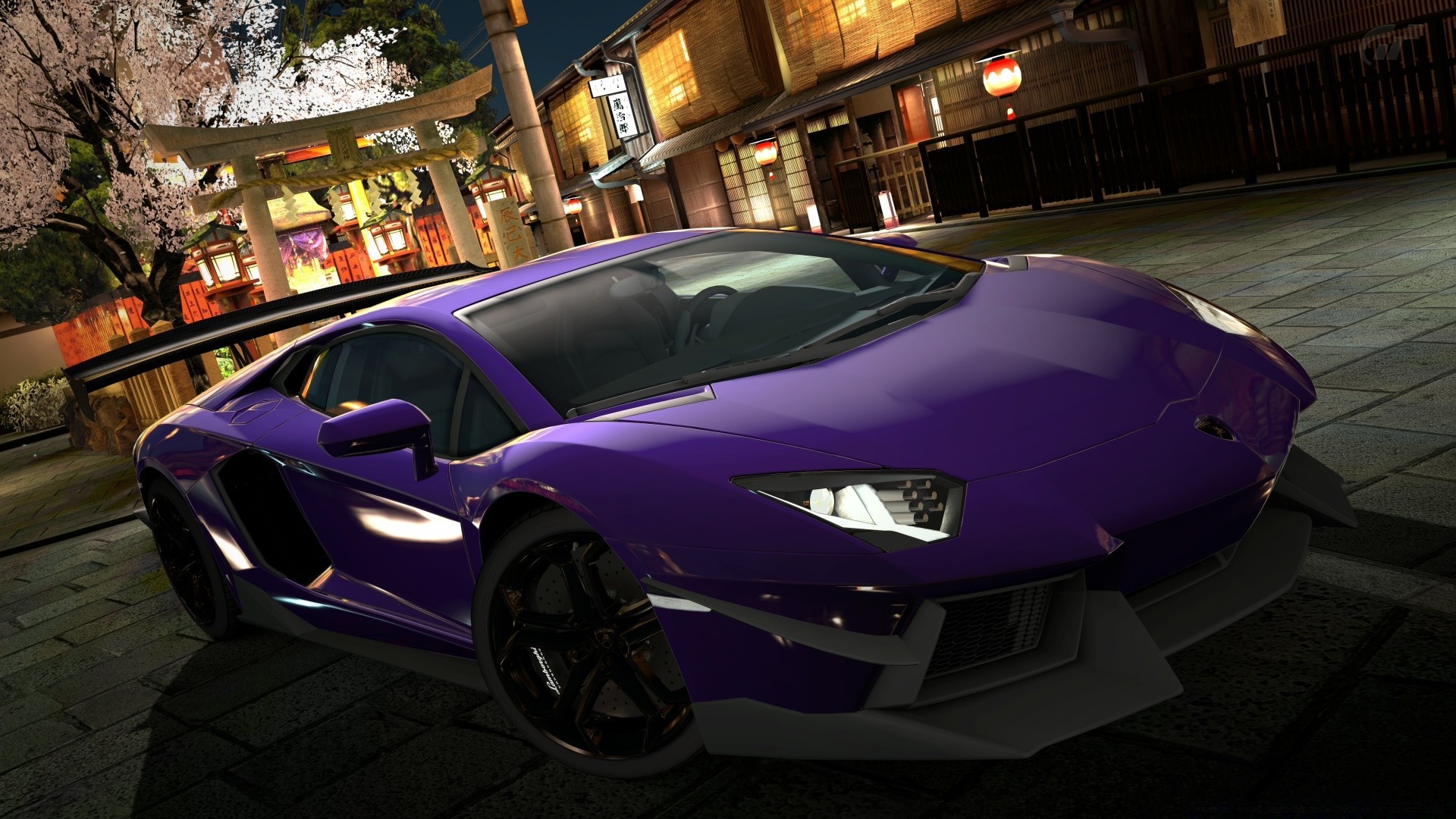 Carro esportivo brilhante na rua perto de um pequeno edifícioCarro esportivo brilhante na rua perto de um pequeno edifício