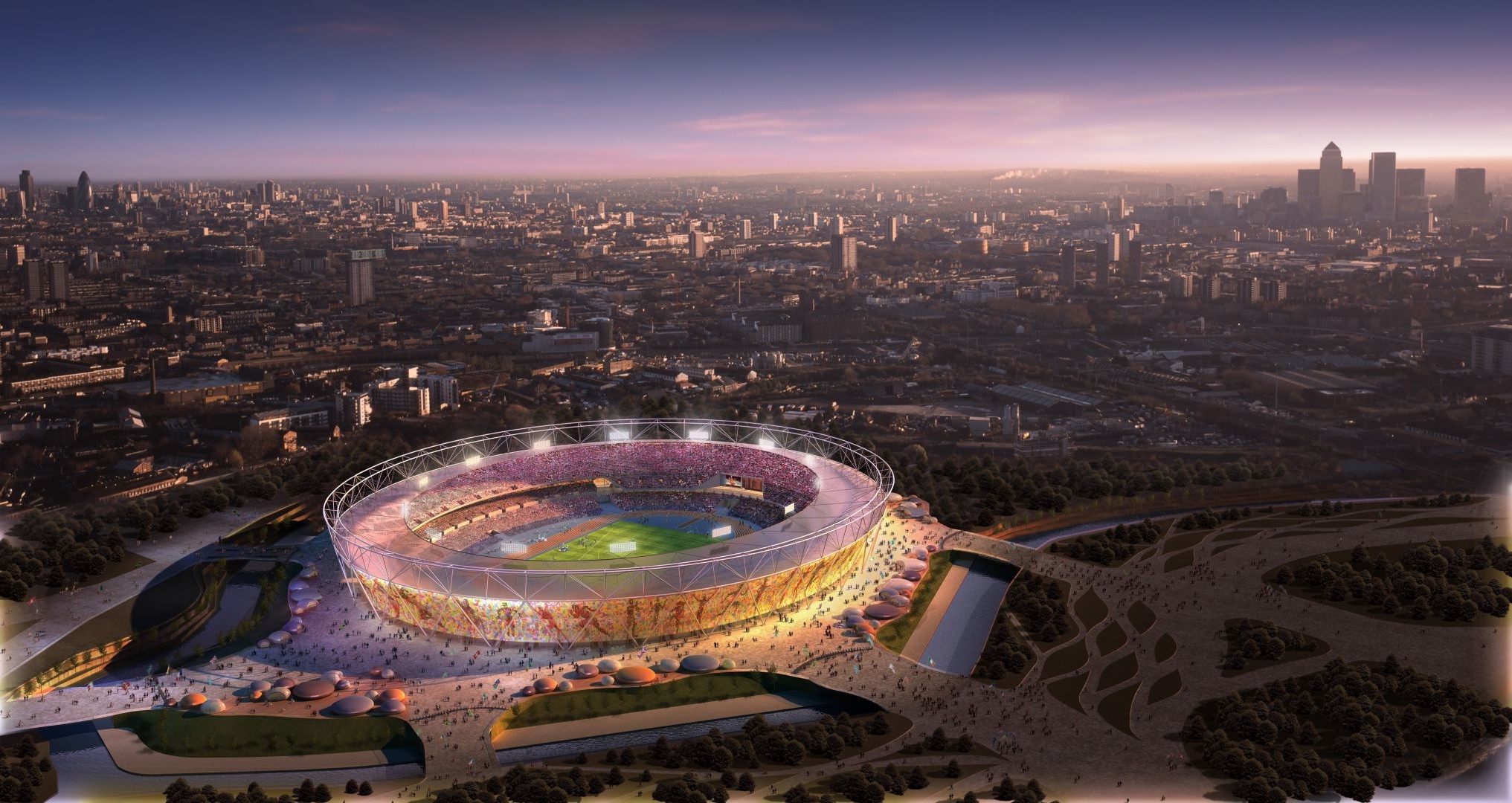 Estádio de futebol com lanternas vermelhas