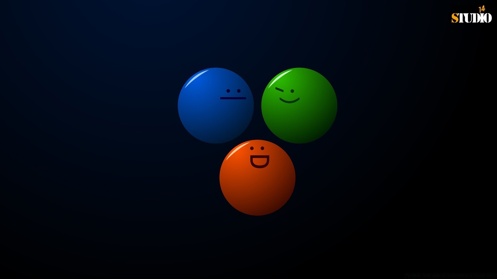 Duas bolas lilás desfocadas se fundem em uma grande bola azul desfocada em um fundo escuro