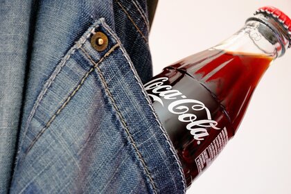 Há uma garrafa de cola no bolso das calças de ganga.Há uma garrafa de cola no bolso das calças de ganga.
