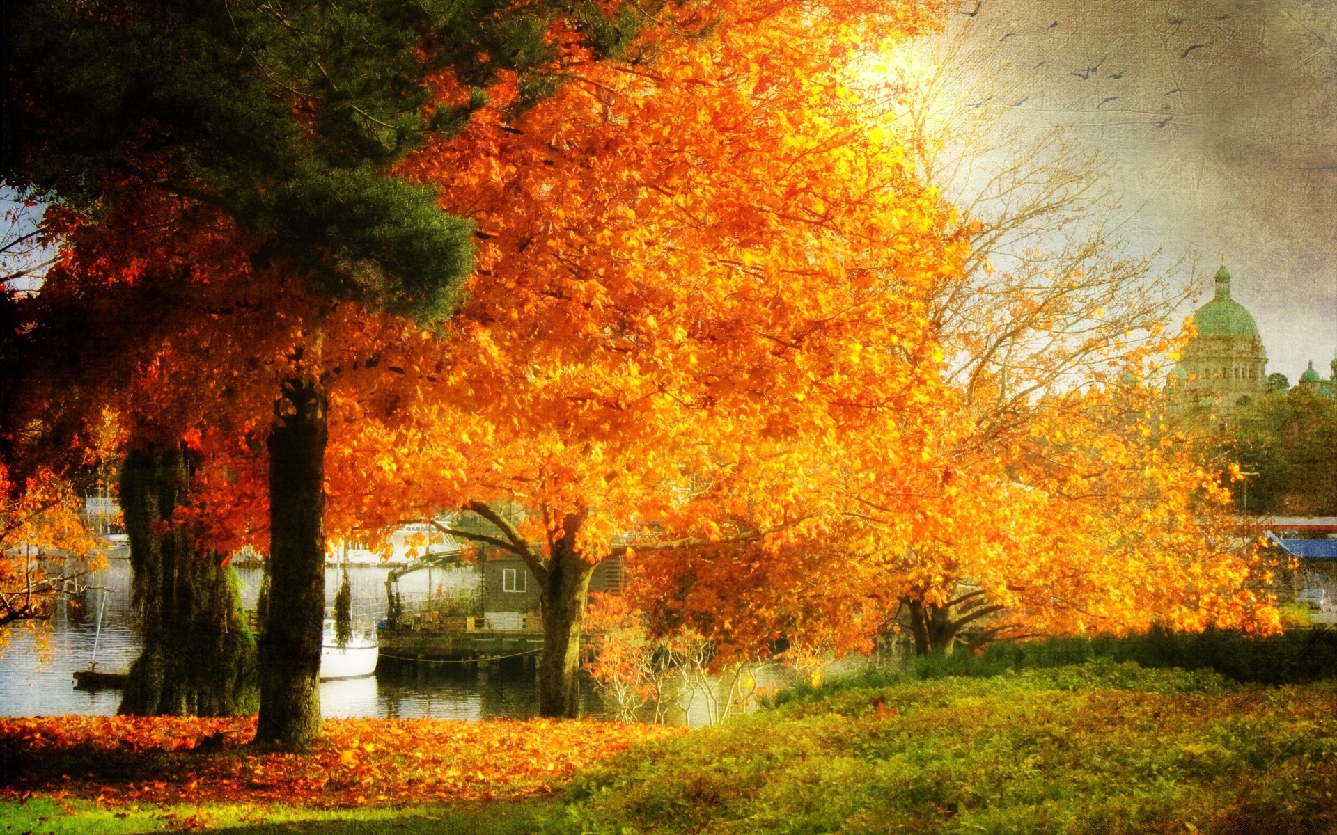 Paisagem bonita do outono triste: árvores, superfície da água, grama