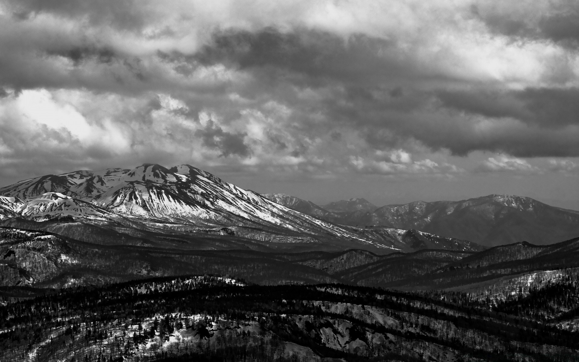 Montanhas e árvores de Natal em uma noite de neve no fundo da lua brilhante