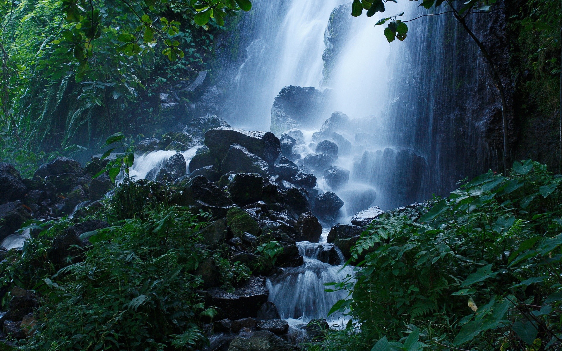 Jatos finos de uma cachoeira banham as árvores na encosta da montanha