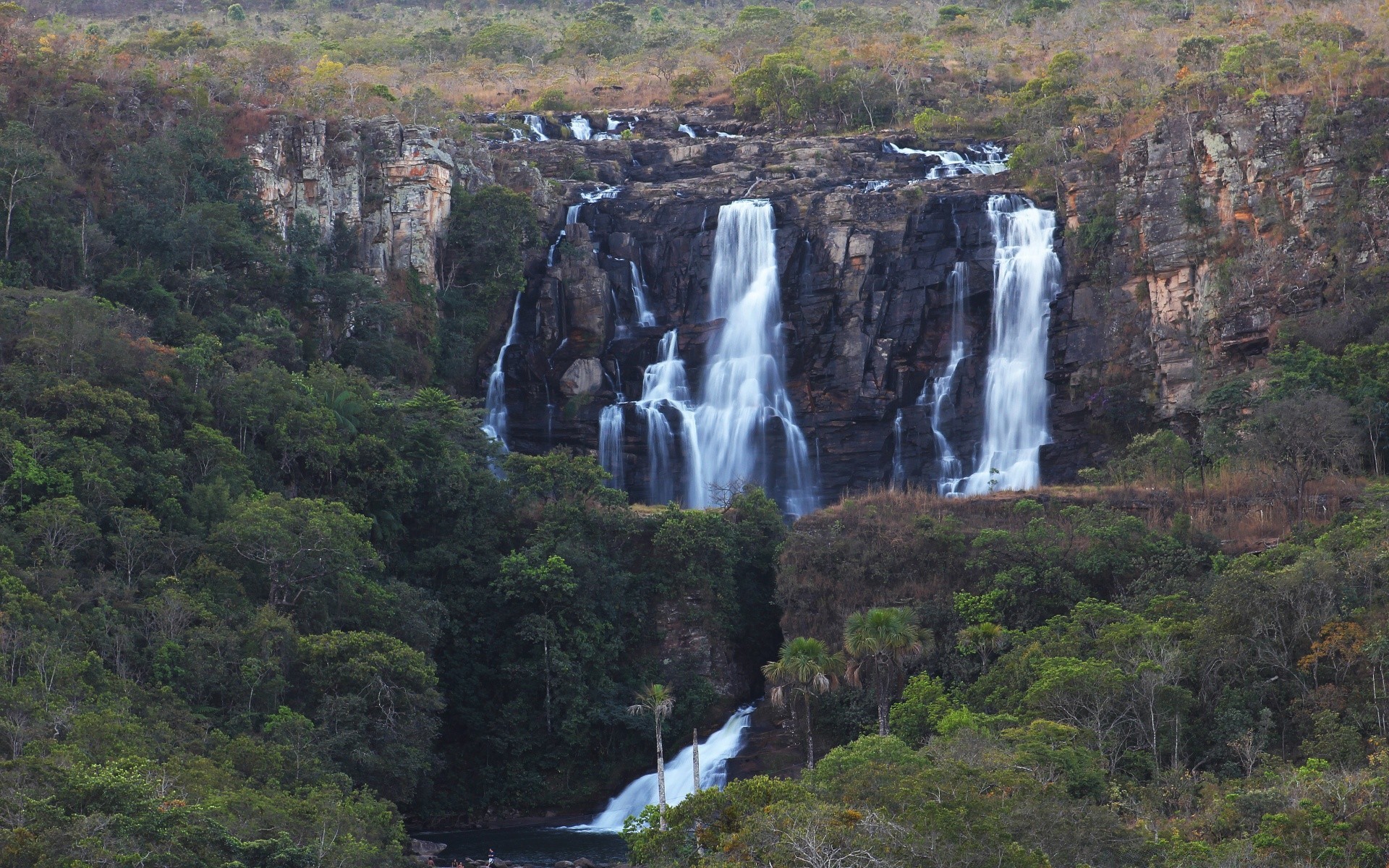 Muitas cachoeiras ao pôr do sol nas montanhas