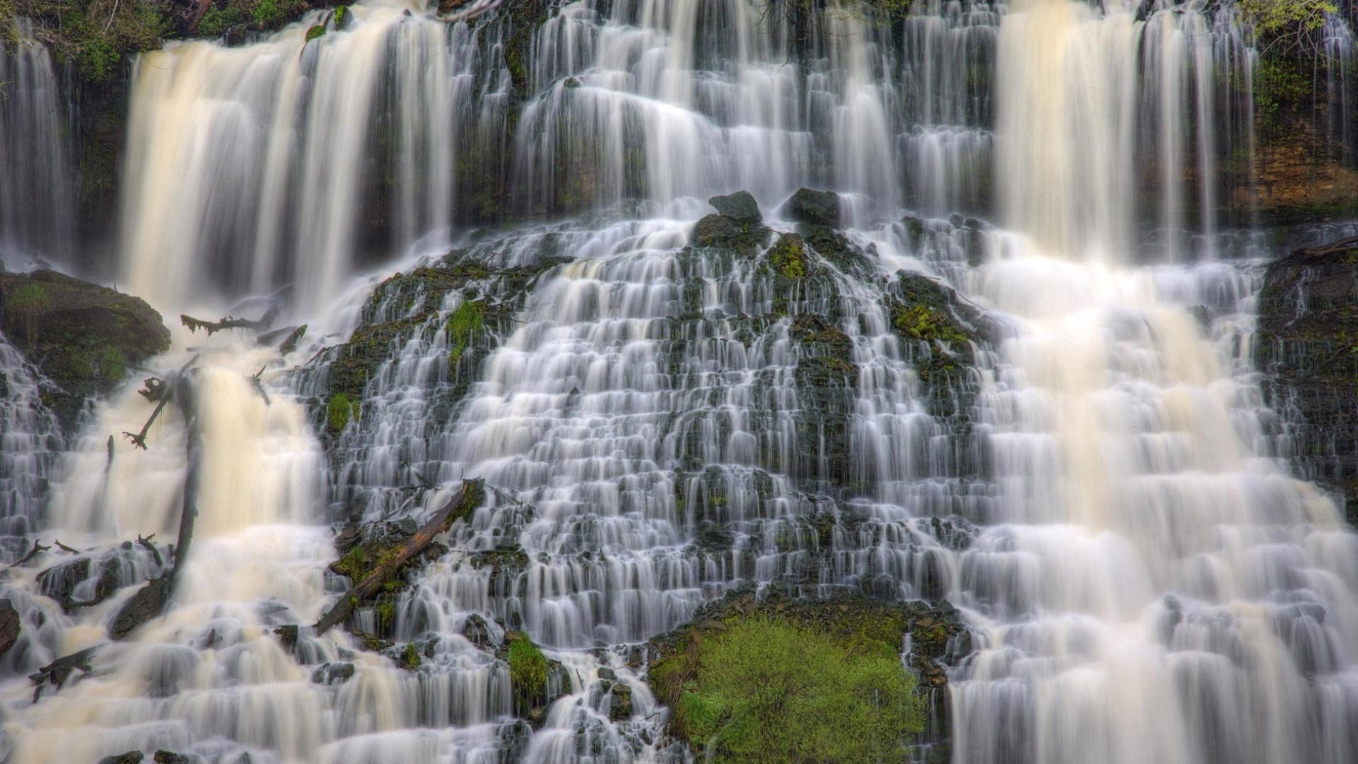 Jatos finos de uma cachoeira banham as árvores na encosta da montanha