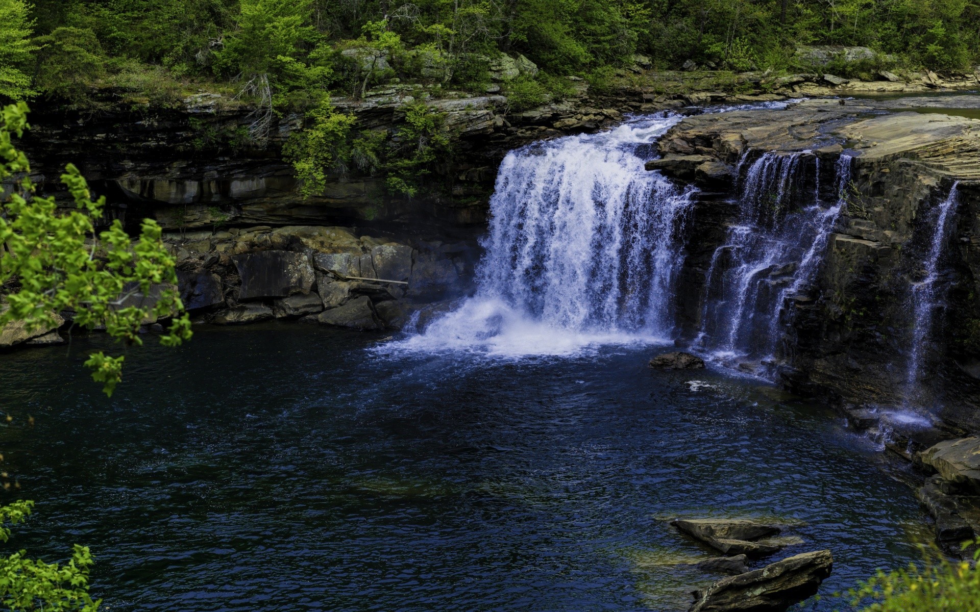 Rio com sombra verde e com cachoeira