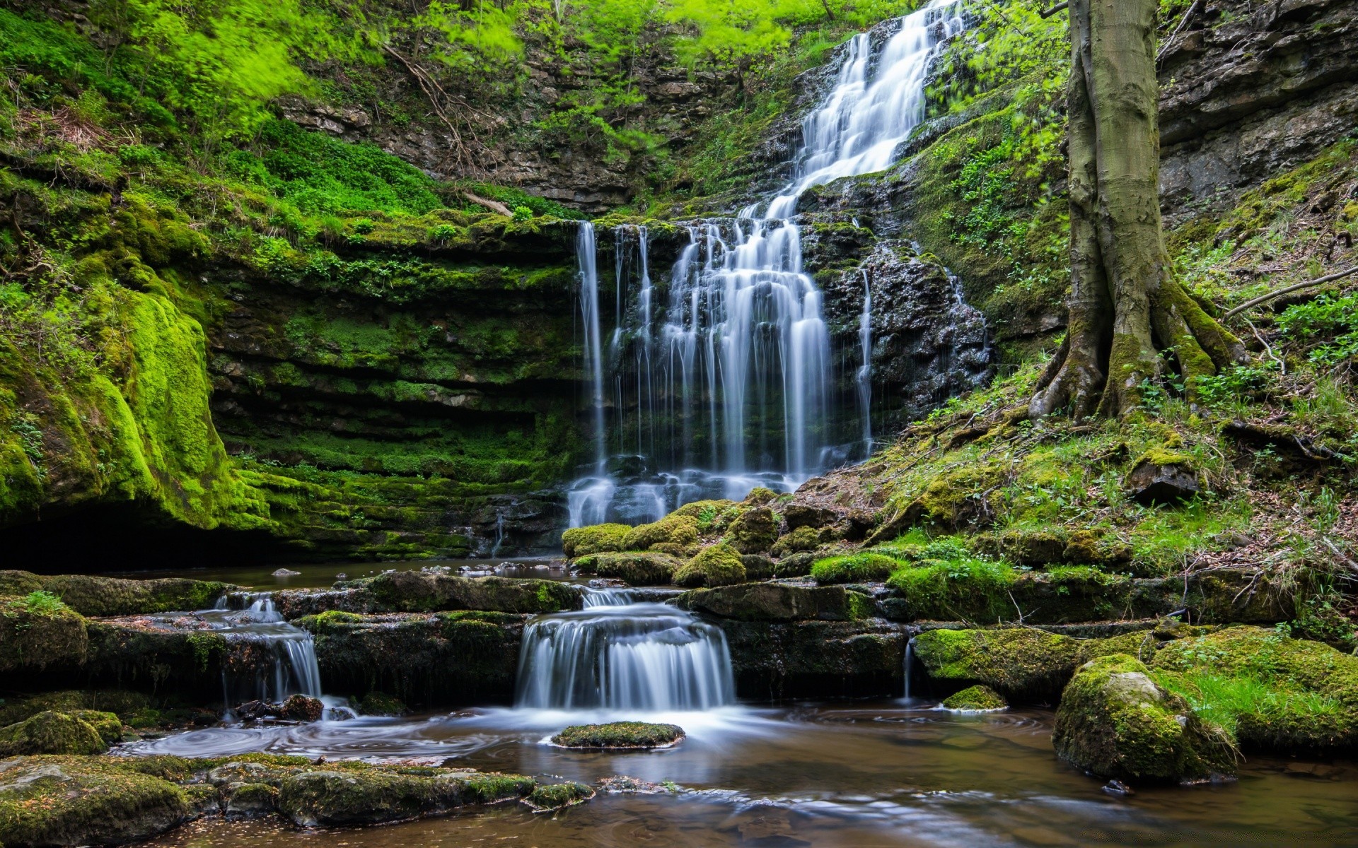 Paisagem de verão de uma cachoeira entre árvores em uma encosta de montanha