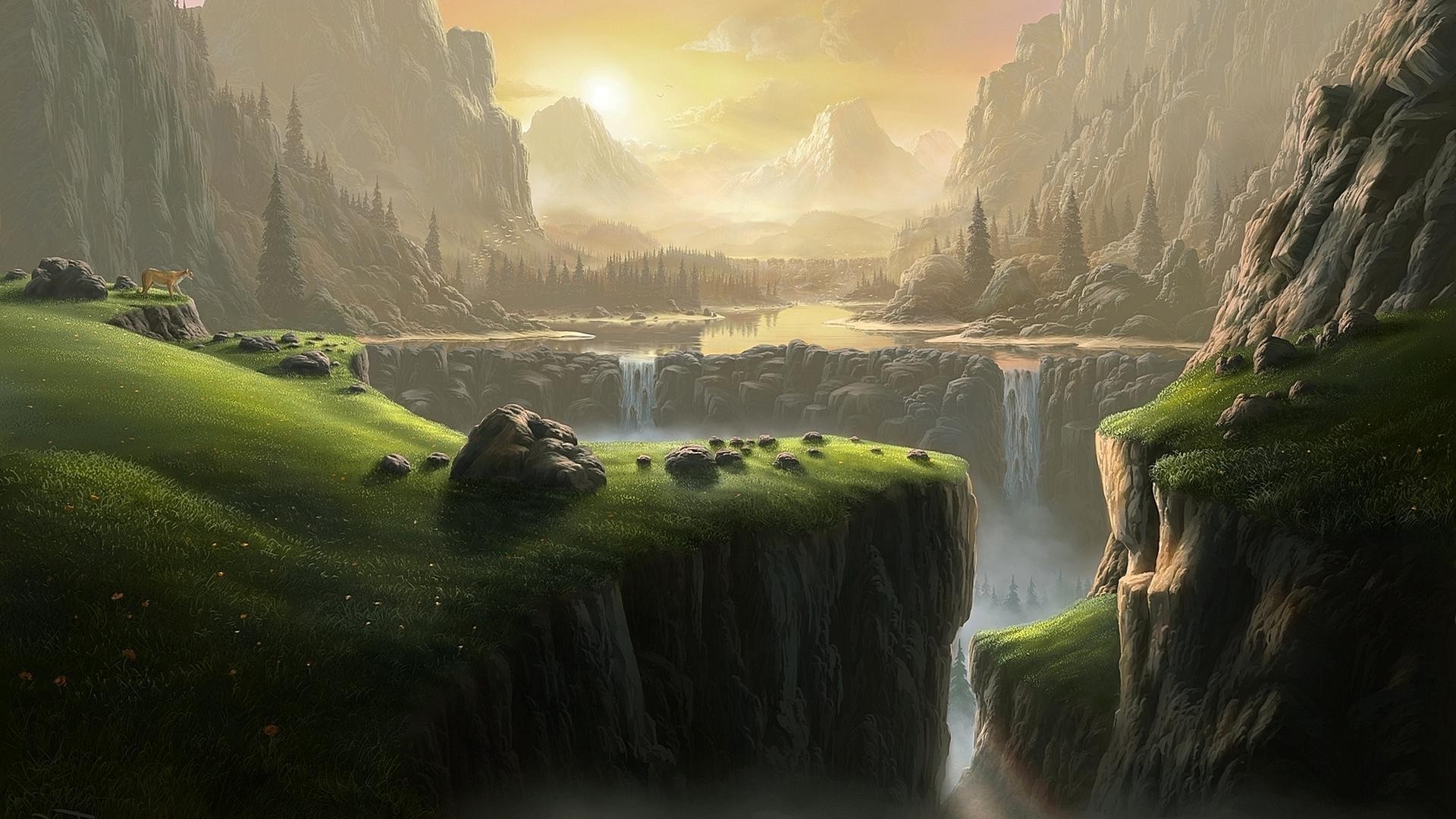 Uma bela paisagem com cachoeiras e montanhas ao amanhecer