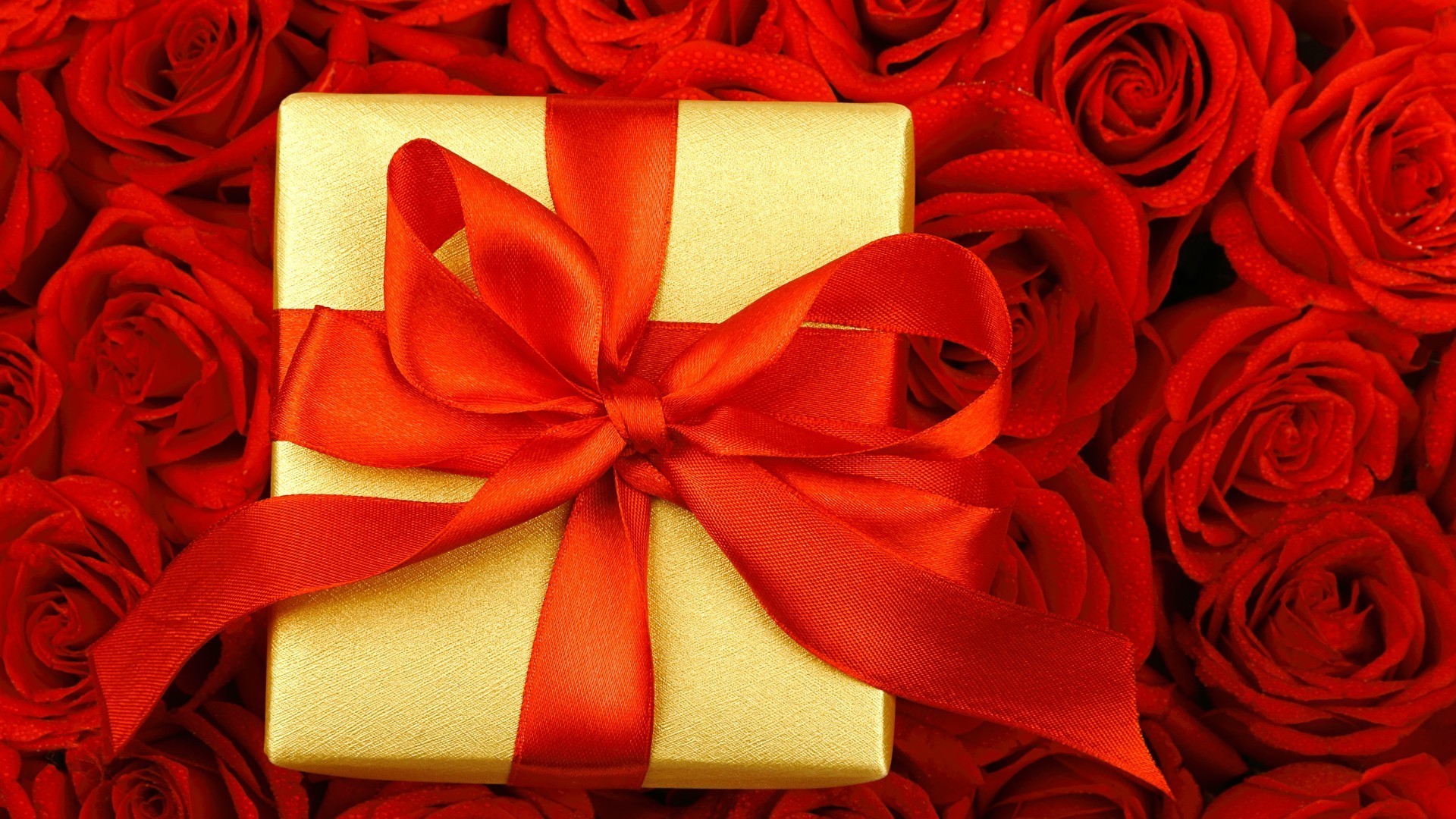 Caixa amarela com arco vermelho em rosas vermelhas