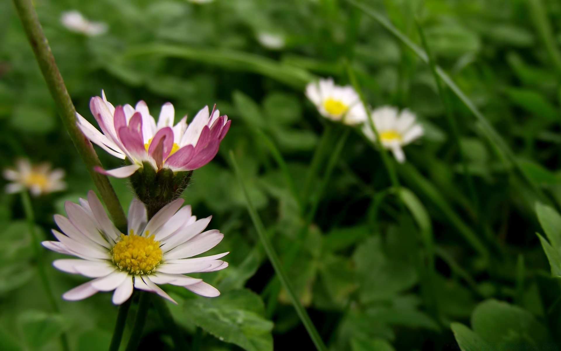Parte da flor de camomila em tons de azul sobre um fundo verde