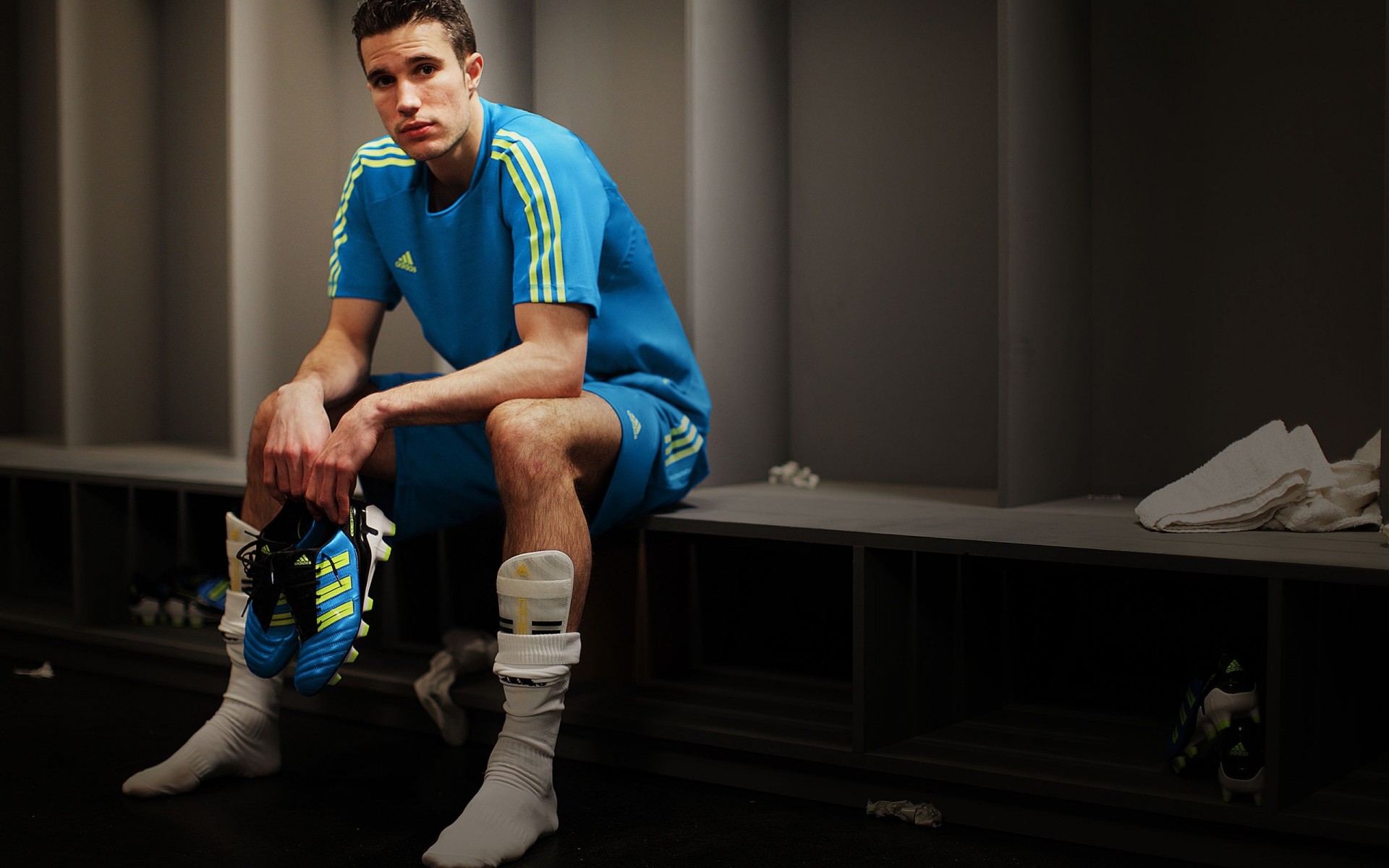 Jogador de futebol cansado no vestiário vazio