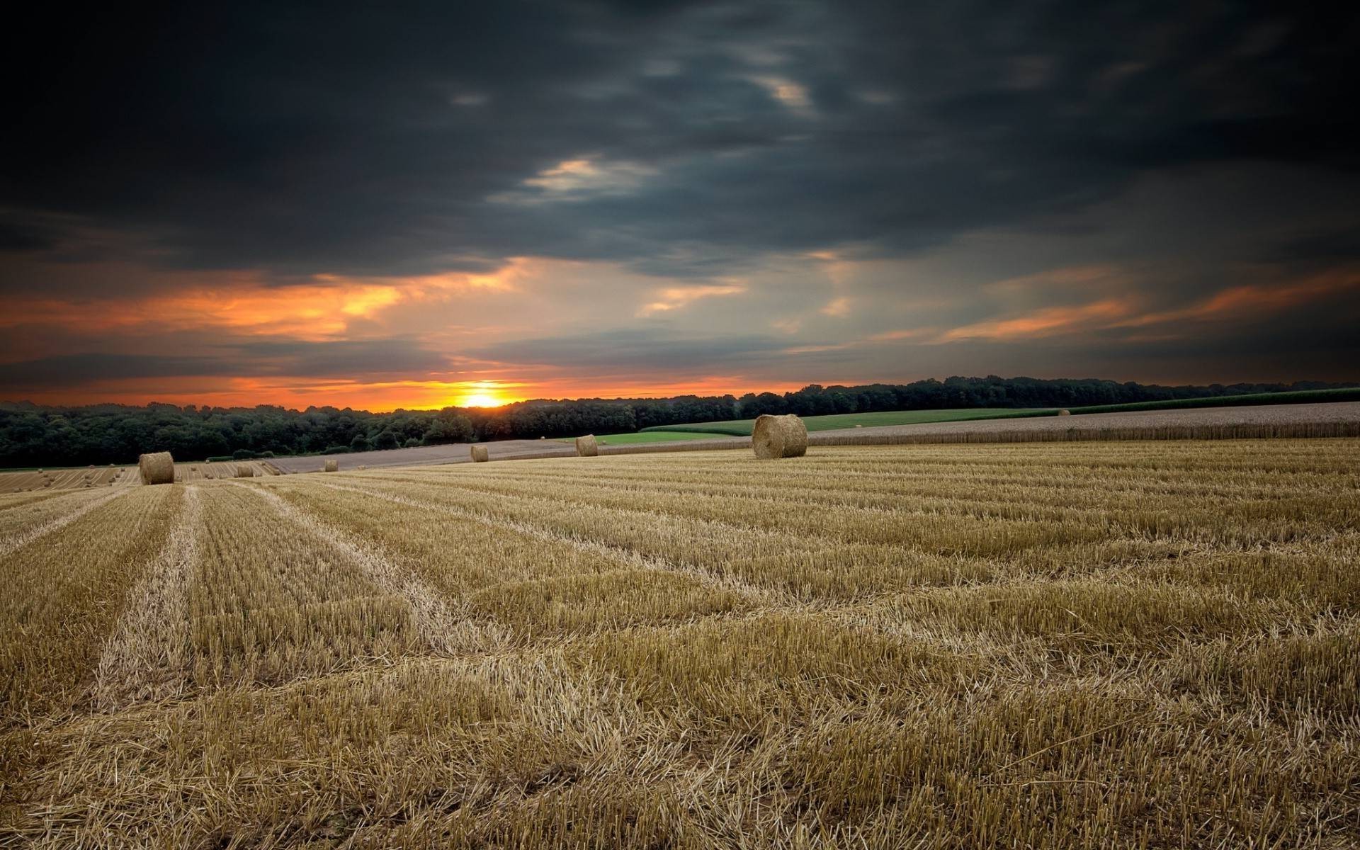 Campo de grama cortada recolhido em fardos ao pôr do sol
