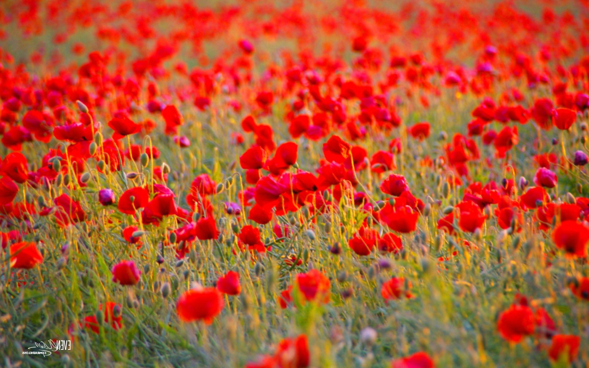 Brilhante-campo vermelho de papoulas e verdes