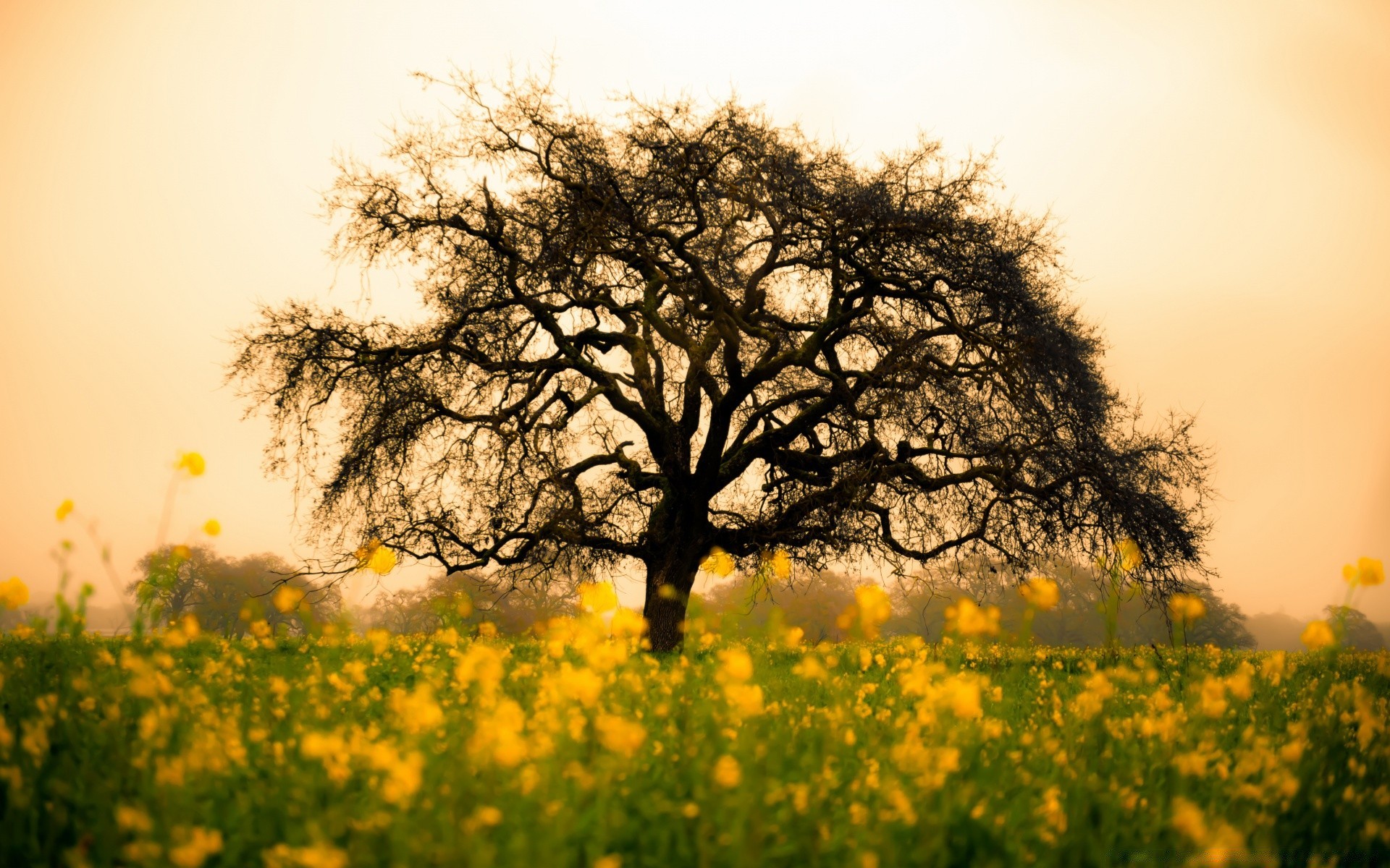 Paisagem em tons de amarelo: sol, campo e folhagem