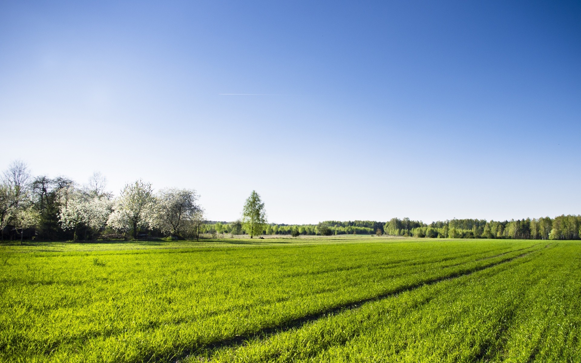 Pôr do sol paisagem em meio a campos verdes e montanhas