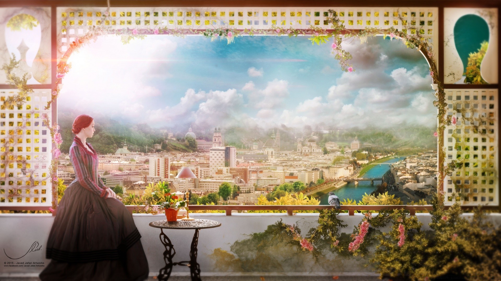 Menina com o cabelo solto na varanda no fundo da cidadeMenina com o cabelo solto na varanda no fundo da cidade