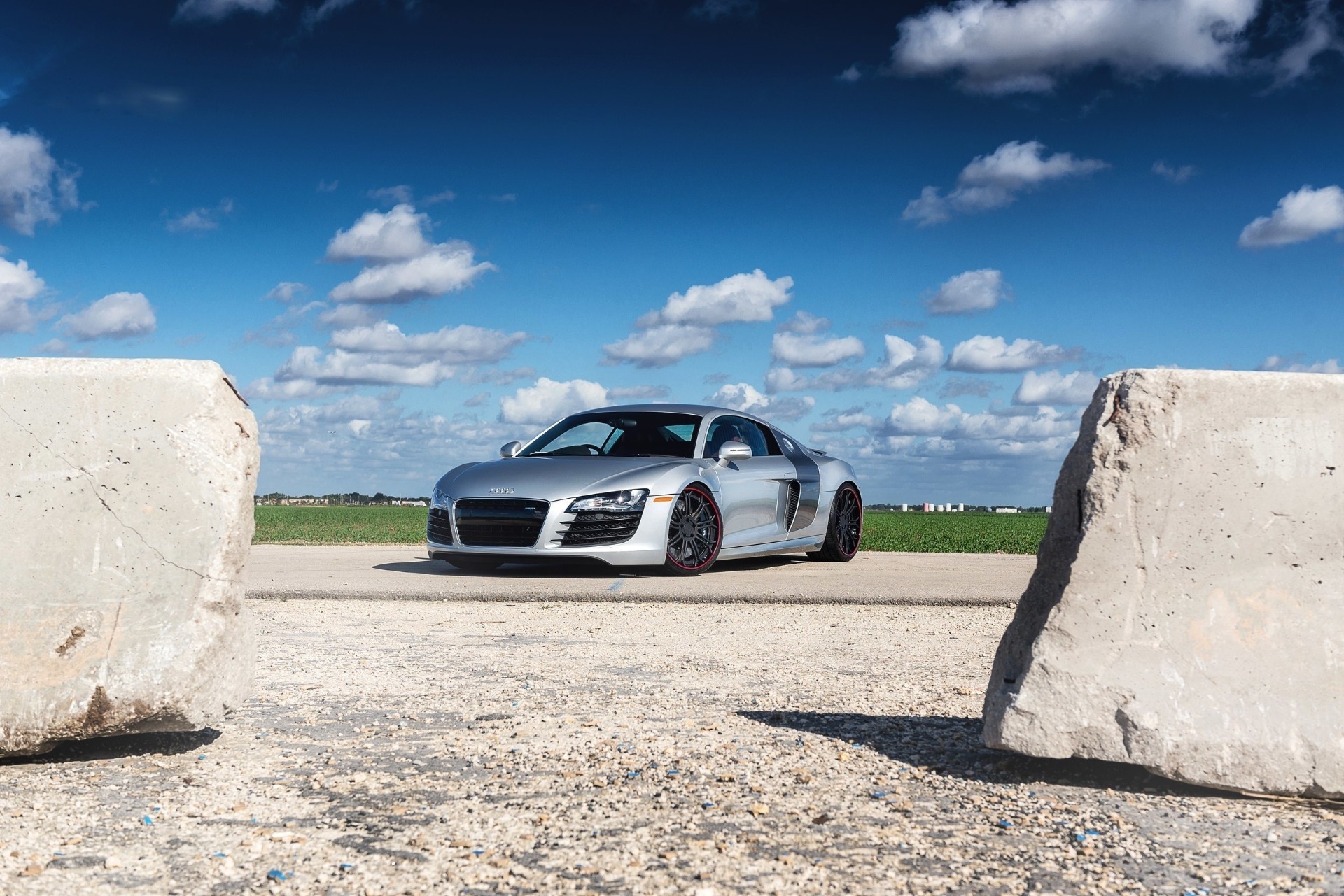 Carro esportivo entre blocos de concreto