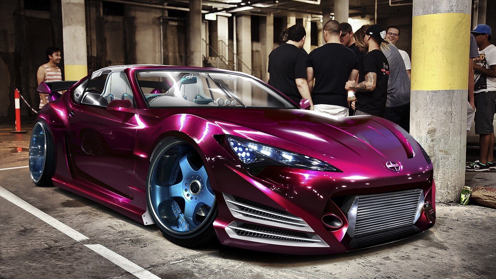 Carro preto com discos prateados em fundo gradiente