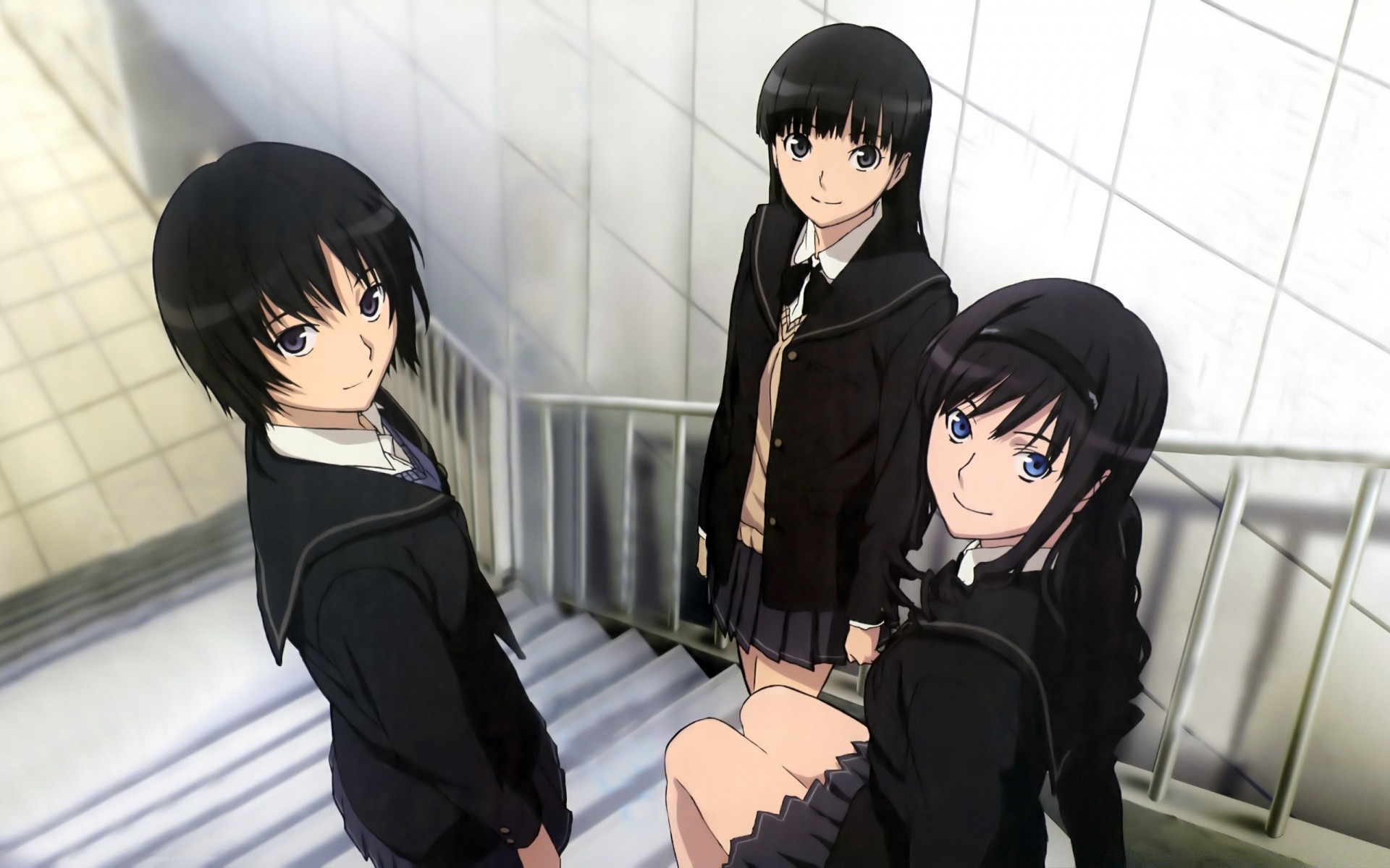 Três alunas de anime na escada