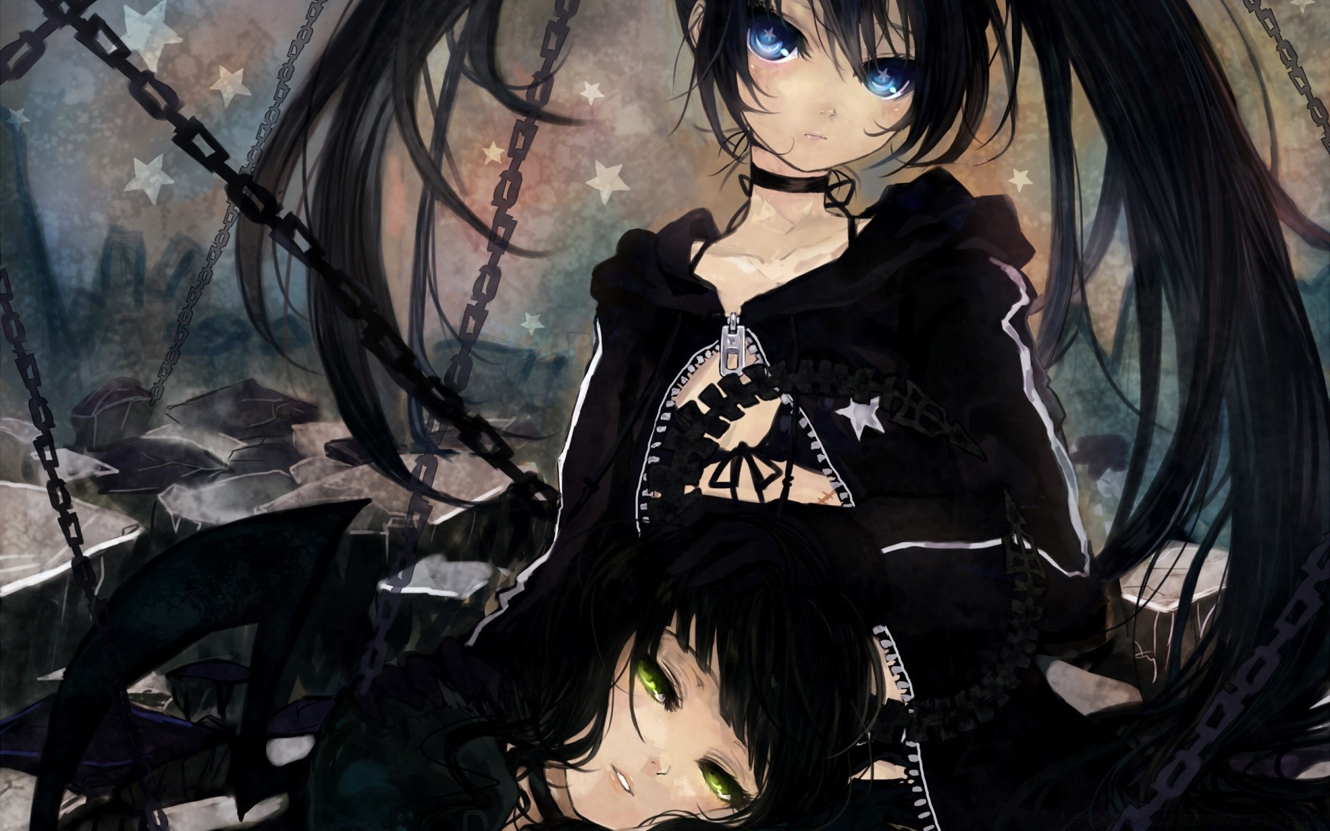 Duas personagens de anime em vestidos curtos e meias, com o cabelo esvoaçante