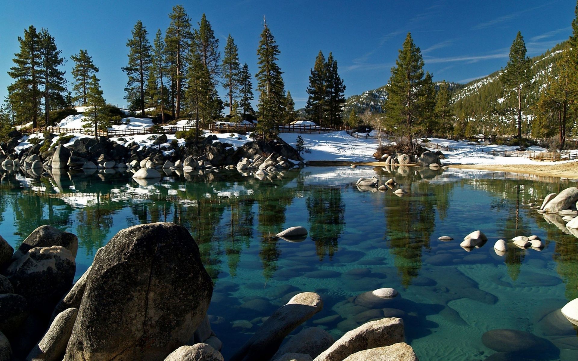 Paisagem ártica de um lago de montanha congelado em margens cobertas de neve sob o céu com luzes do Norte