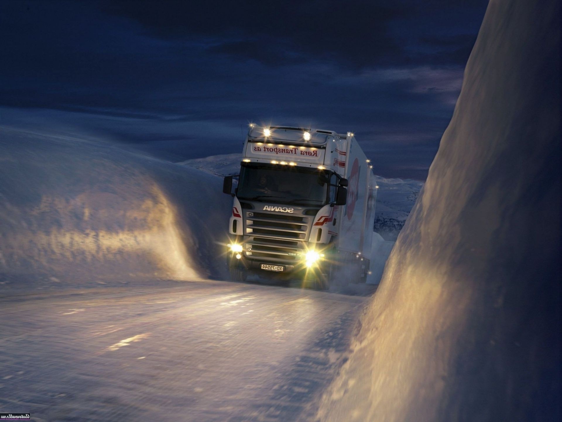 Vagão subindo a montanha em uma pista de neve de inverno à noite