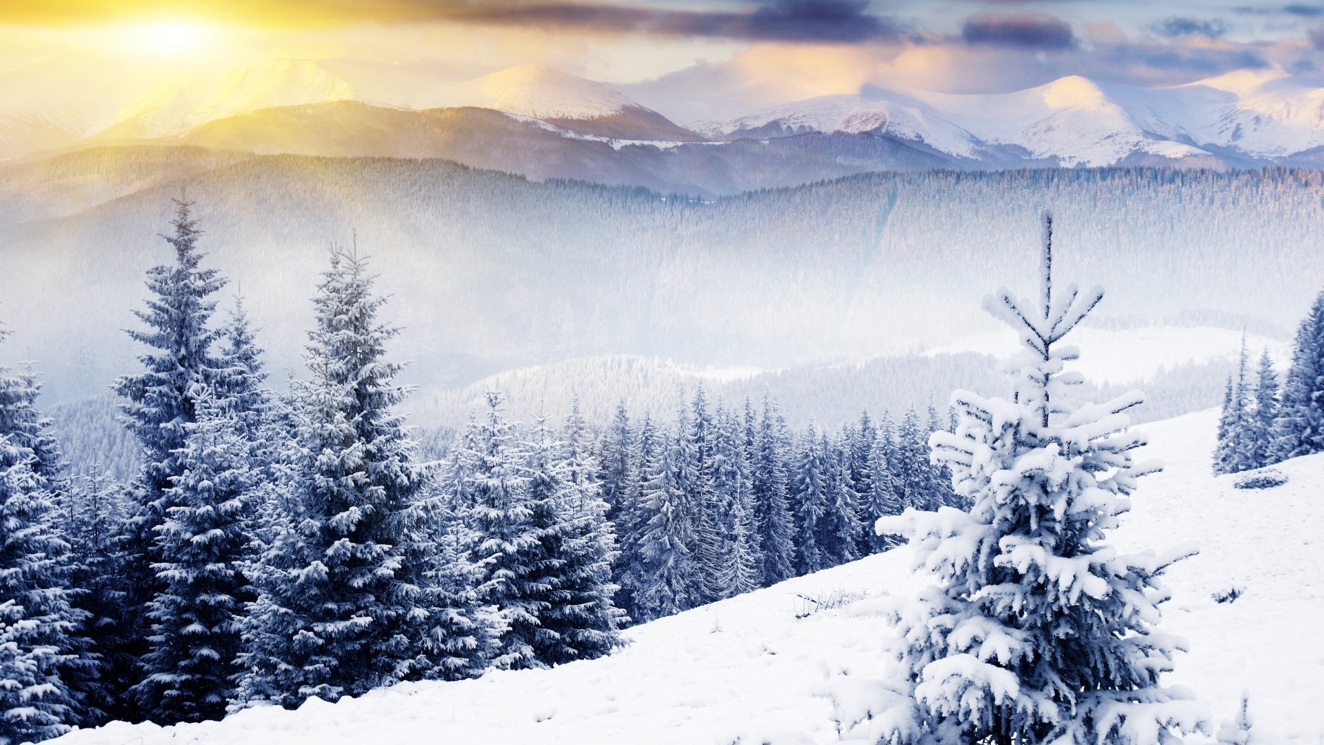 Floresta de inverno com árvores de Natal cobertas de neve e amanhecer