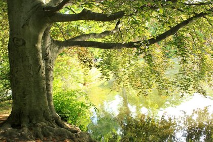 Árvore inclinada sobre um rio calmo