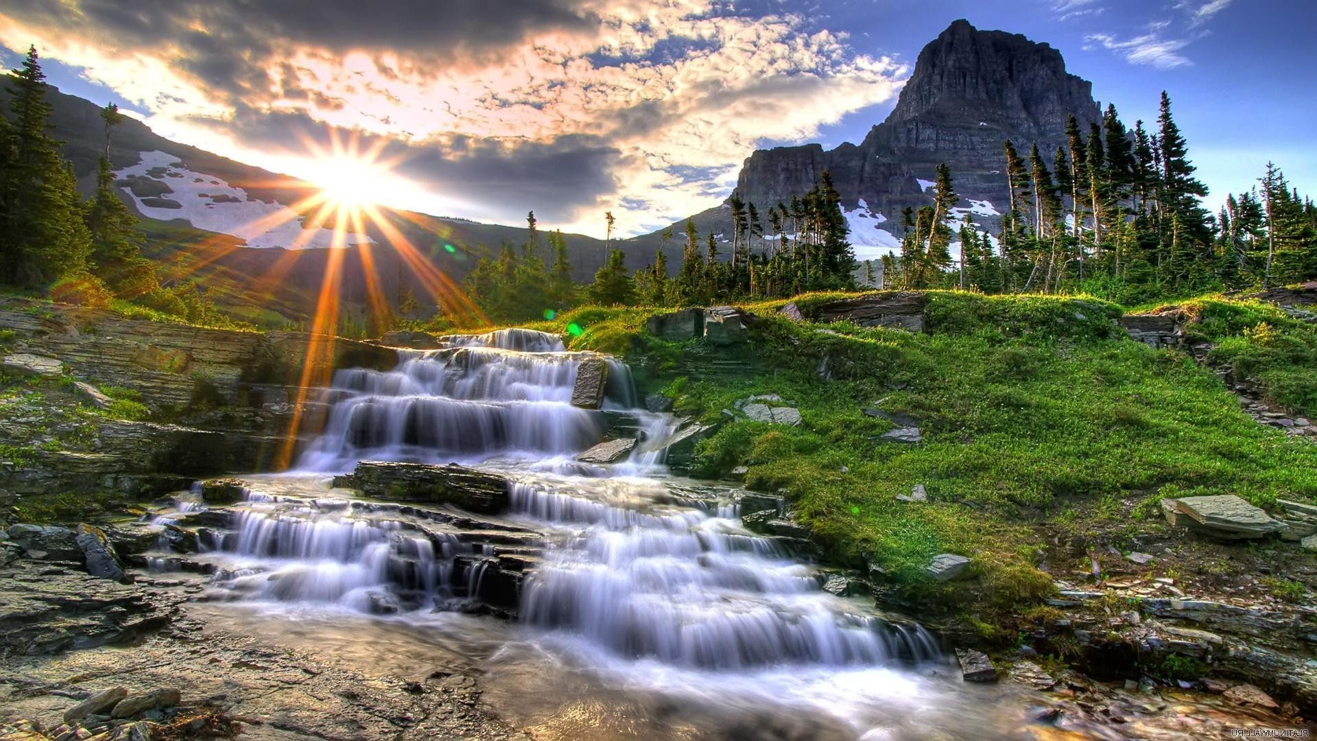 Um arbusto de flores cor-de-rosa perto de uma grande cachoeira