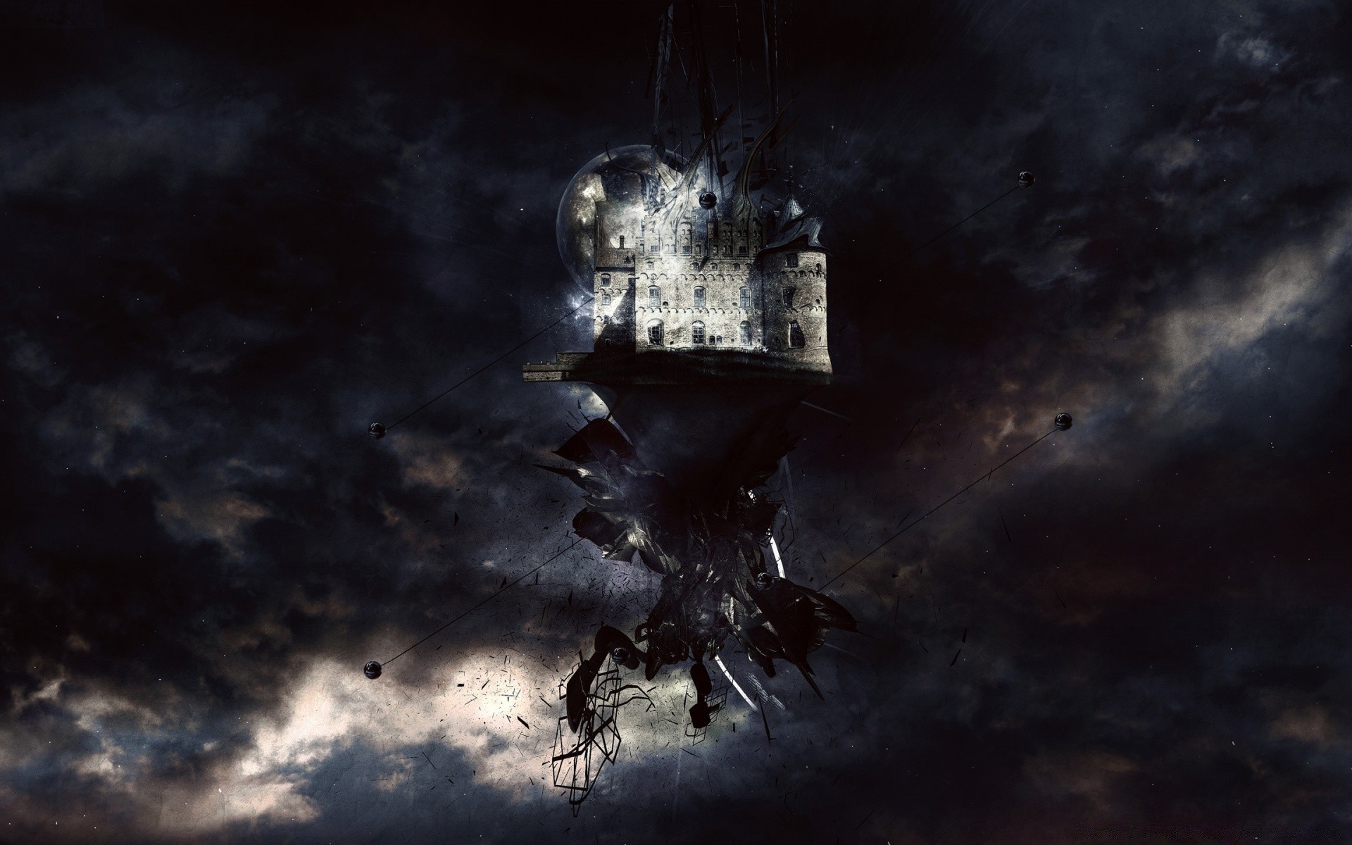 Harry potter com uma varinha mágica no fundo do castelo e do céu escuroHarry Potter com uma varinha mágica no fundo do castelo e do céu escuro