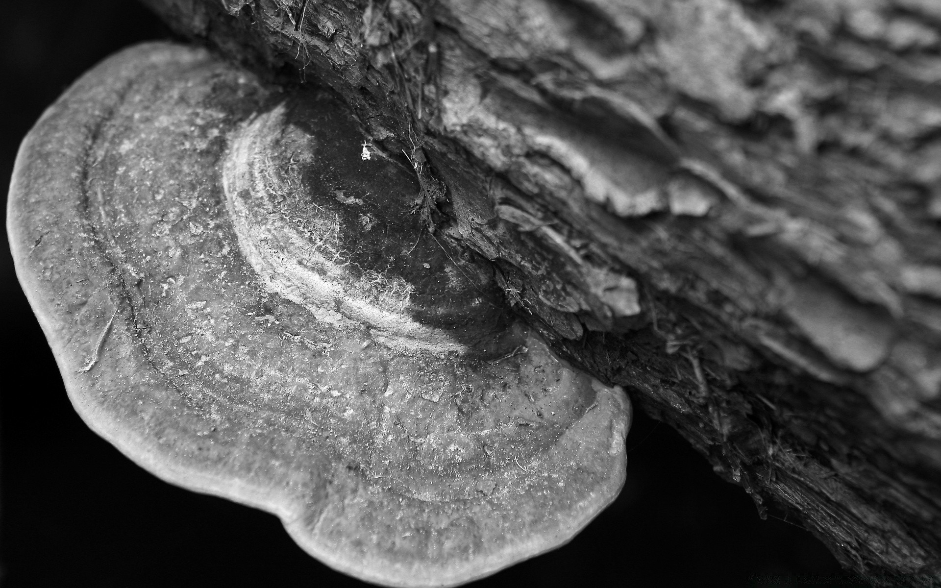 Foto em preto e branco de um cogumelo crescendo em uma árvoreFoto em preto e branco de um cogumelo crescendo em uma árvore