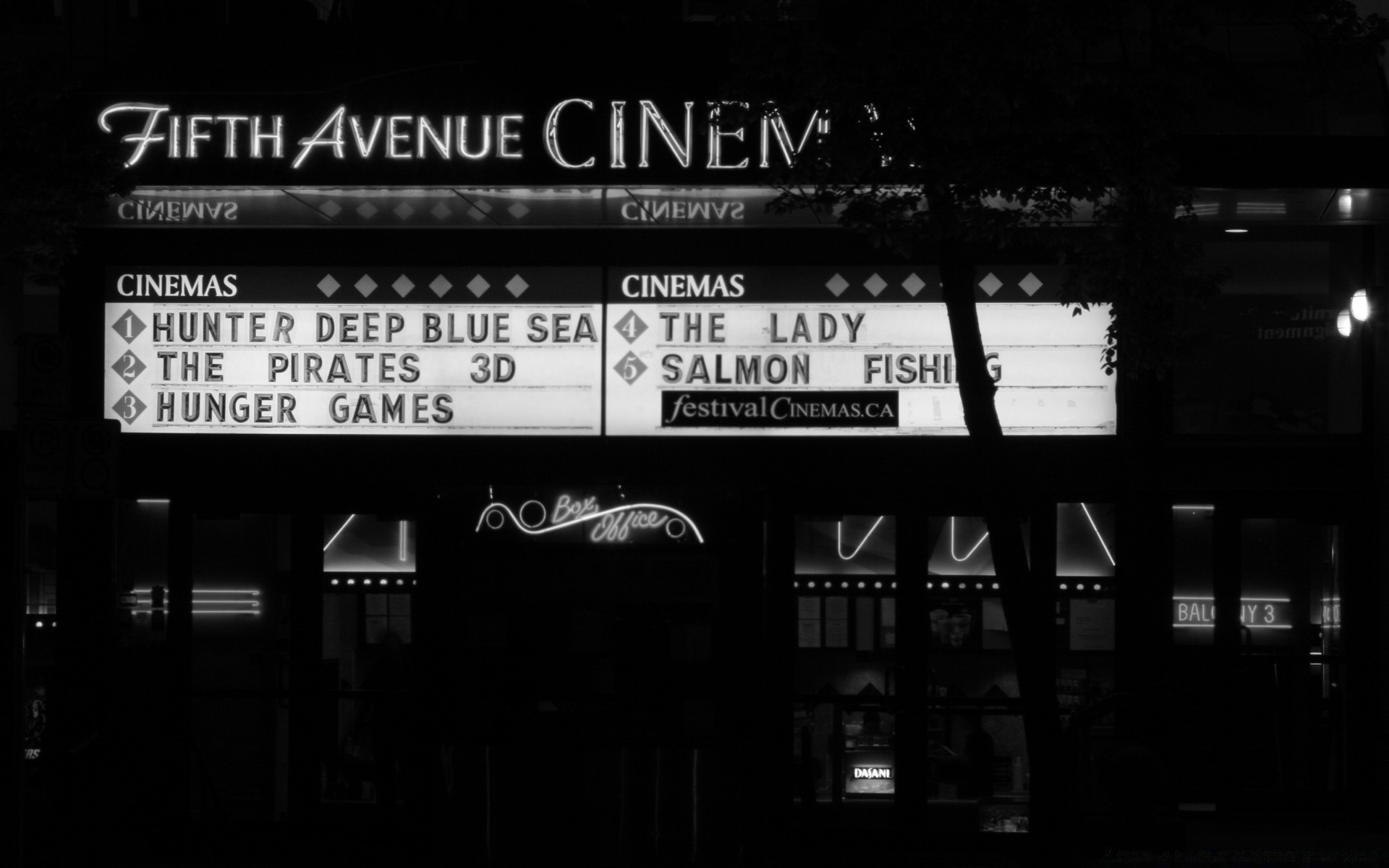 Quadro de avisos branco preto na fachada do cinema