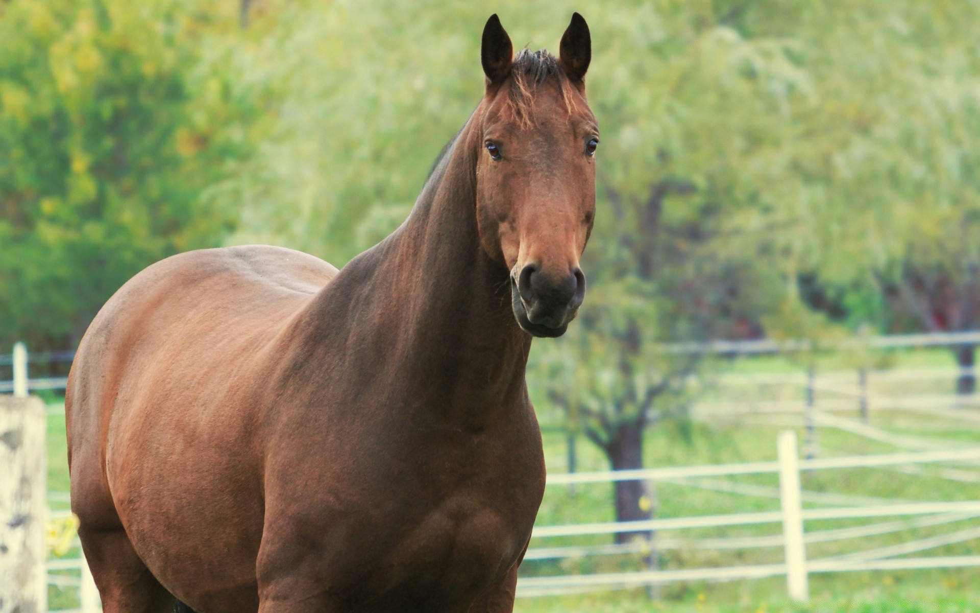 Cavalo vermelho com uma mancha branca na cabeça fica em um curral no gramado