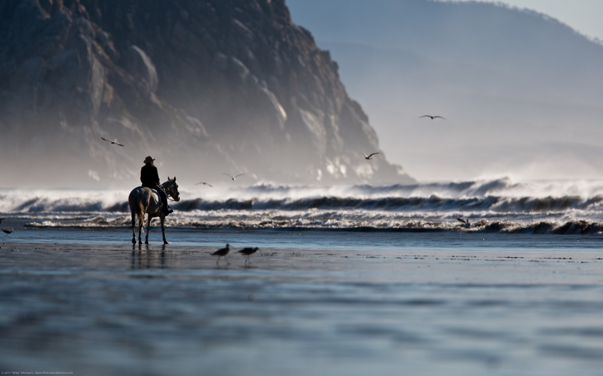 A praia enevoada e o cavaleiro a cavalo