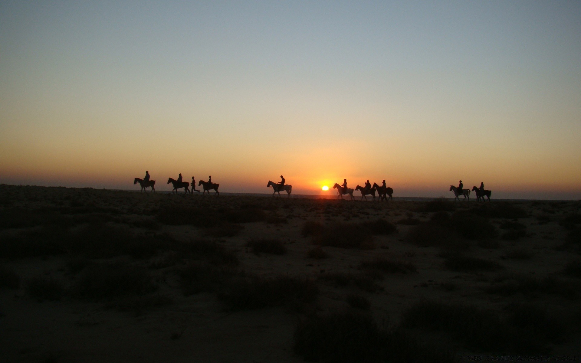 Cavaleiro a cavalo à luz do pôr-do-sol
