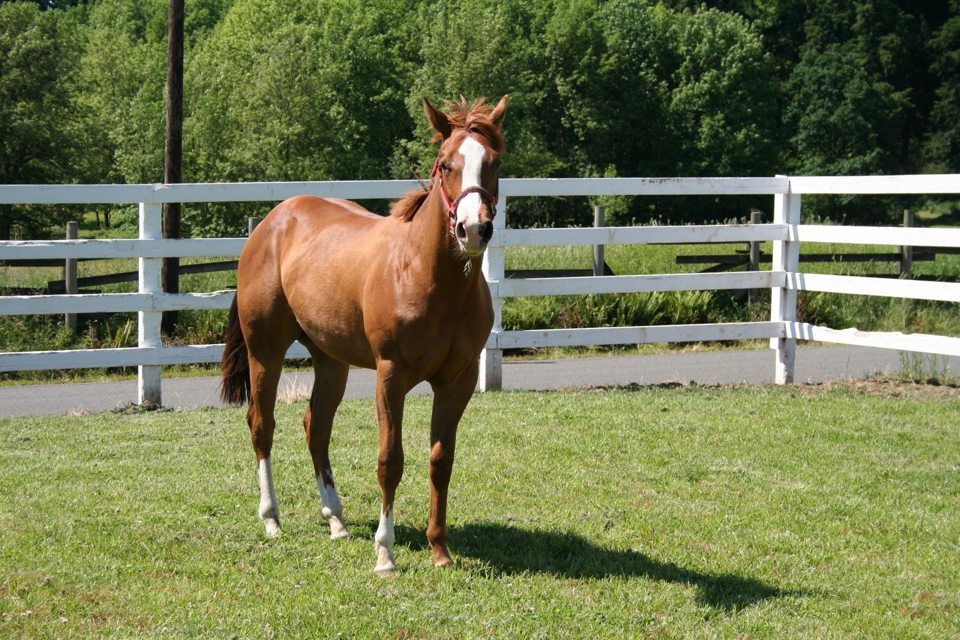 Cavalo vermelho com uma mancha branca na cabeça fica em um curral no gramado