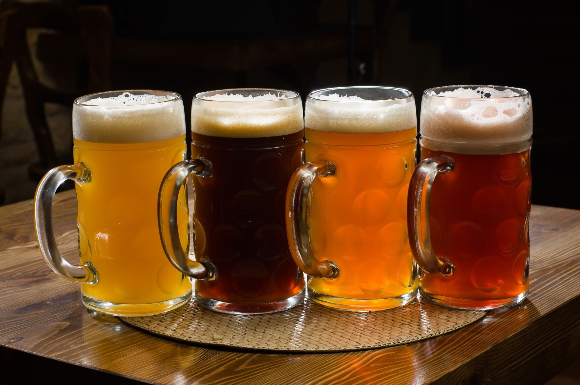 Quatro copos de cerveja com diferentes tipos de cerveja