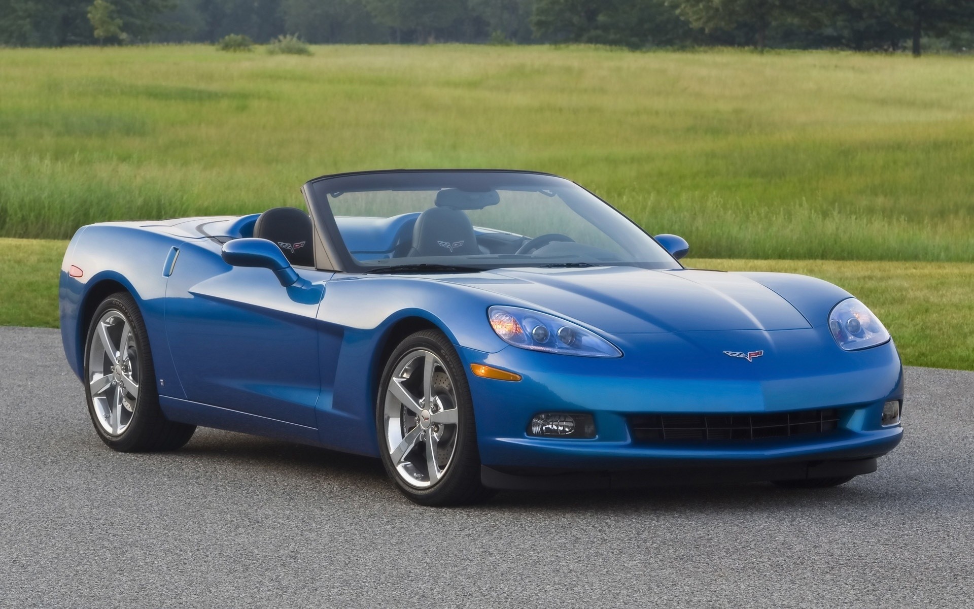 Carro esportivo azul sem teto na estrada ao lado de um campo verde