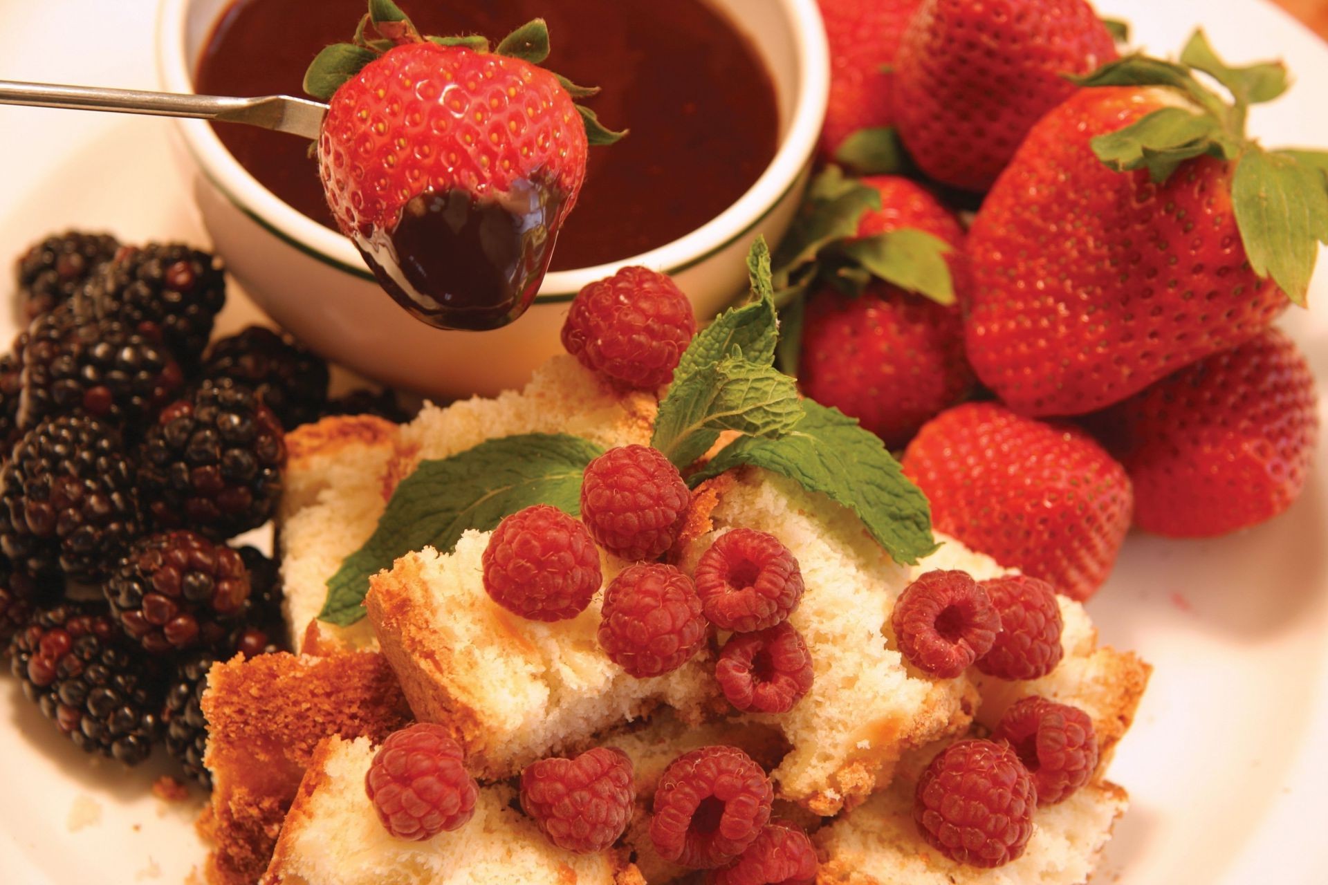 Fondue de chocolate com morangos, framboesas e amoras