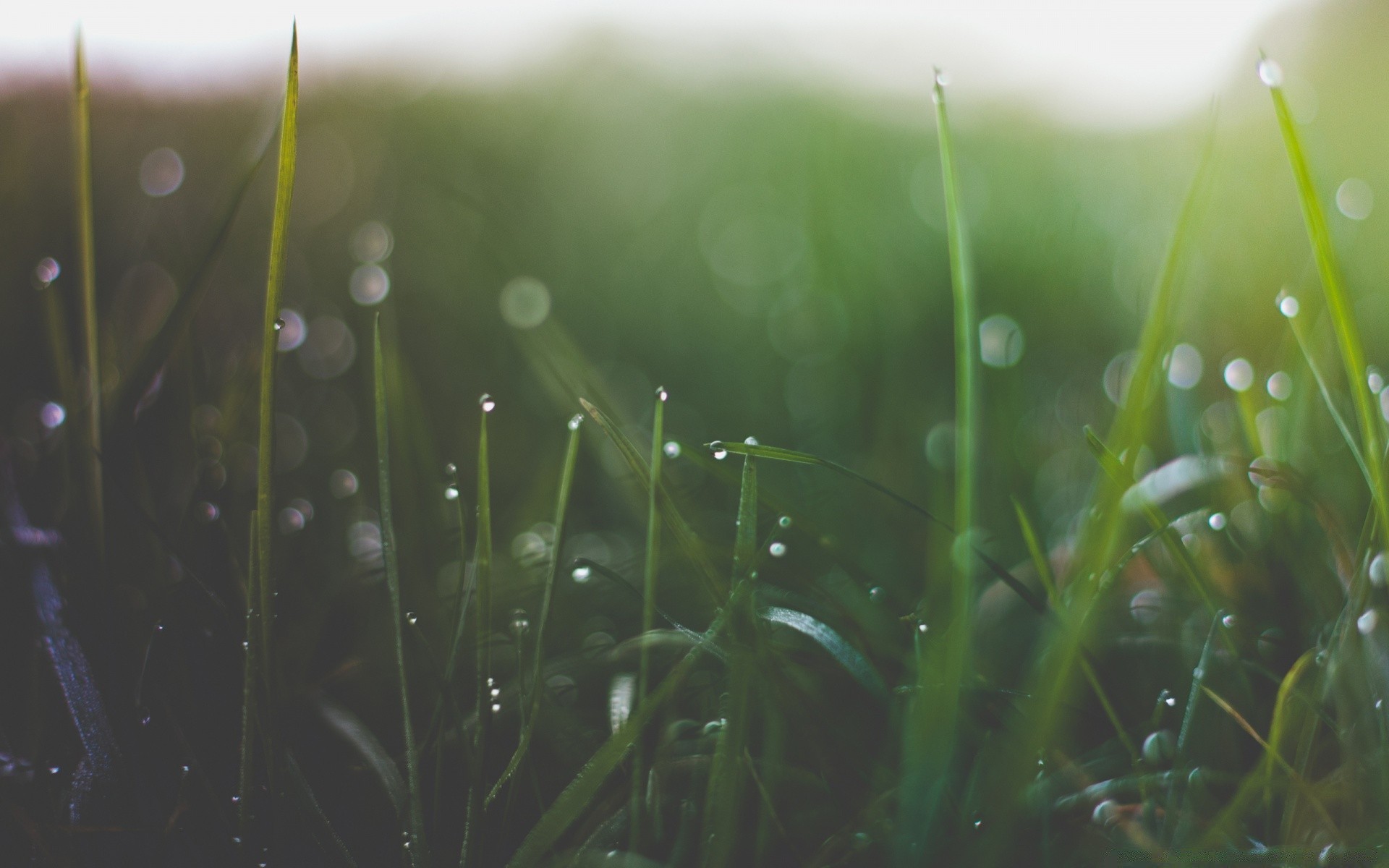 Gotas a escorrem pela relva. Orvalho. Chuva