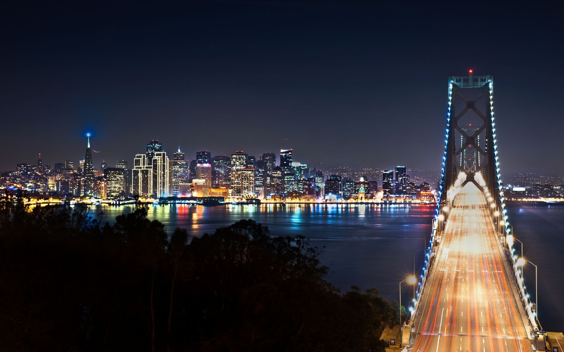 Uma cidade cintilante de todas as cores no horizonte, uma grande ponte em primeiro plano