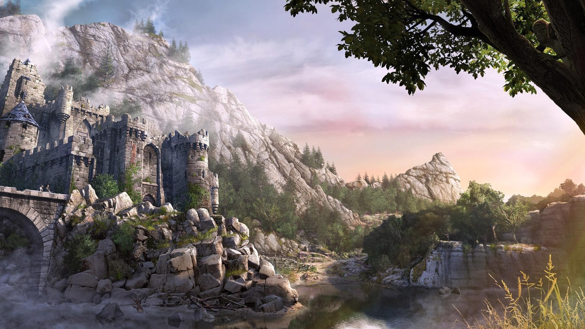 Ponte sobre um lago tranquilo, refletindo árvores em águas calmas