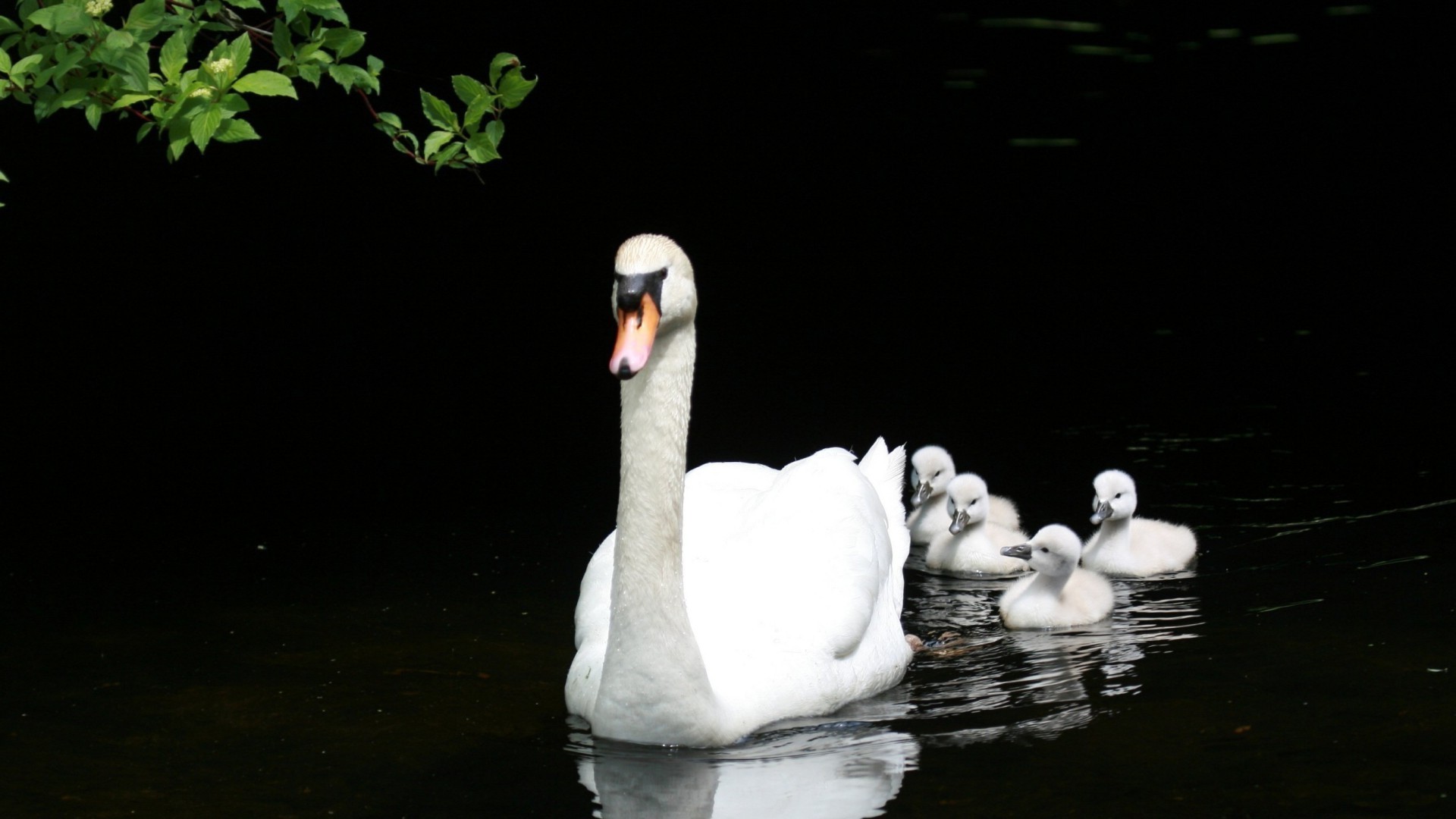 Cisne com filhotes em águas calmas