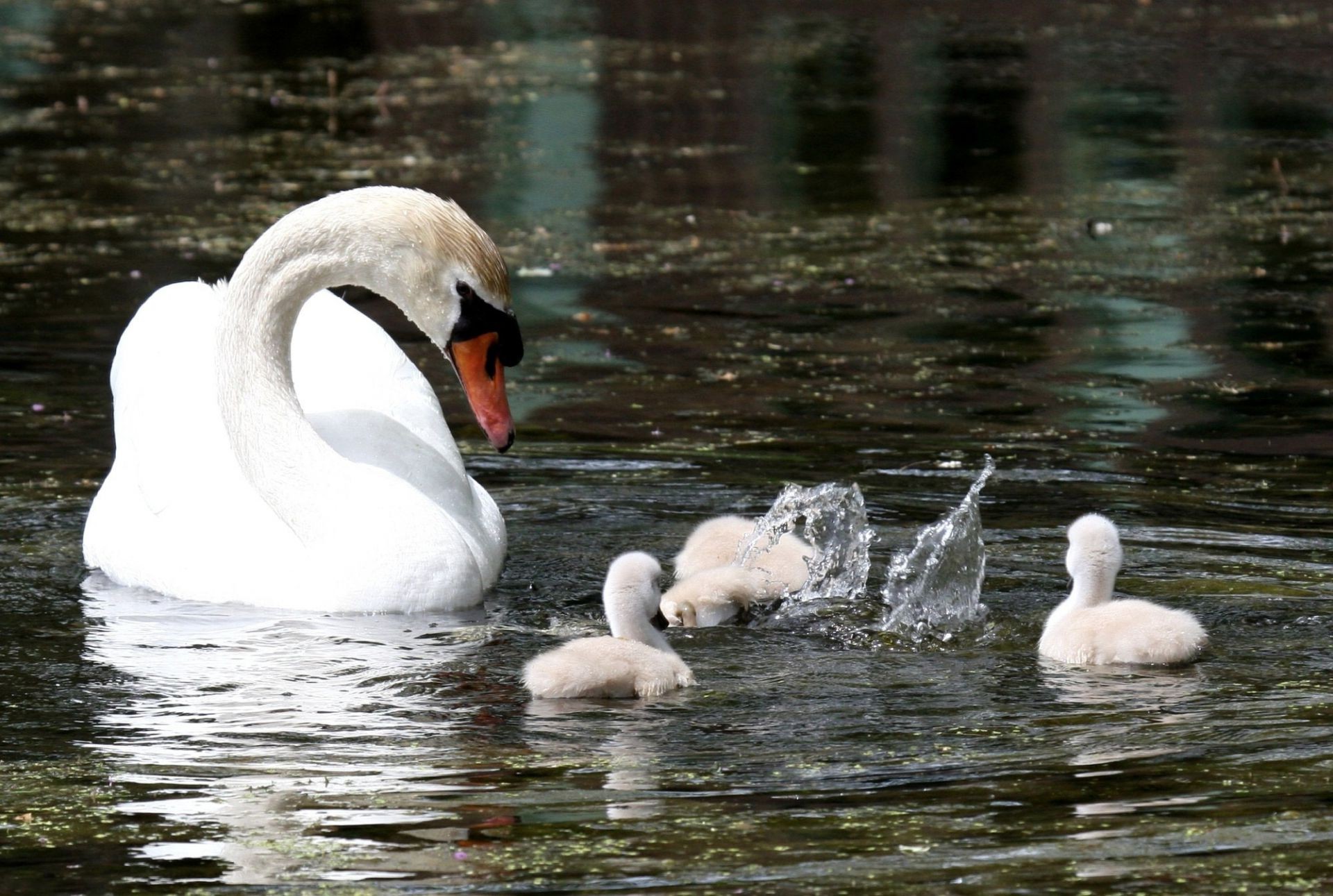 Cisne adulto no lago com filhotes